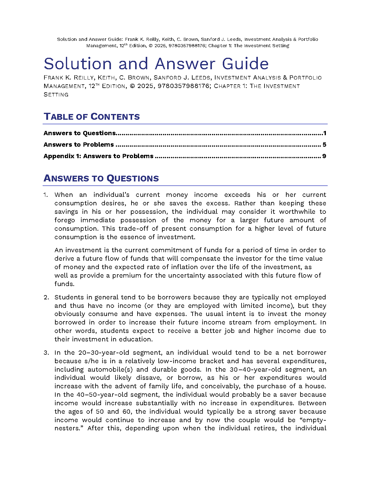 Ace your Finance exams with this comprehensive solution manual for Investment Analysis and Portfolio Management 12e by Frank Reilly, Keith Brown, and Sanford Leeds. Featuring complete solutions to all chapters, you'll gain deep understanding of concepts and prepare for success on your first attempt.