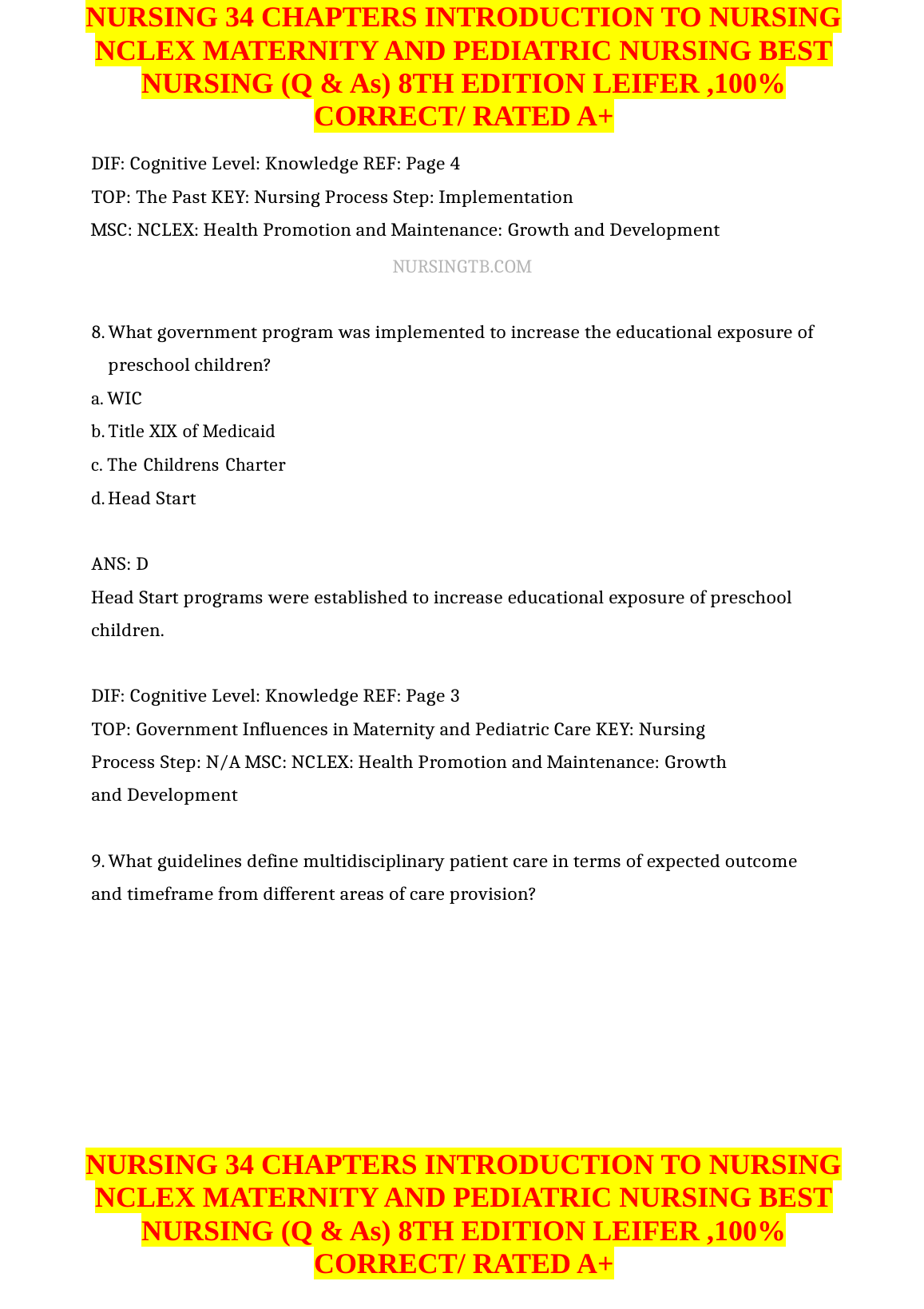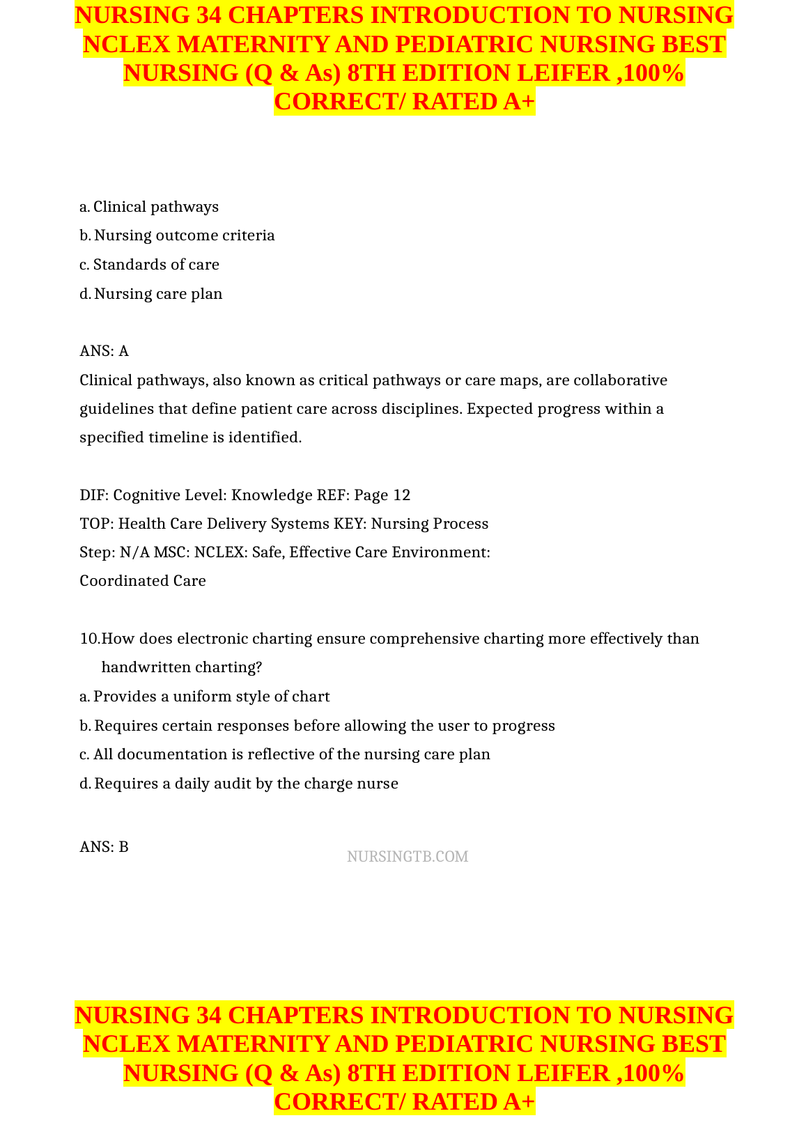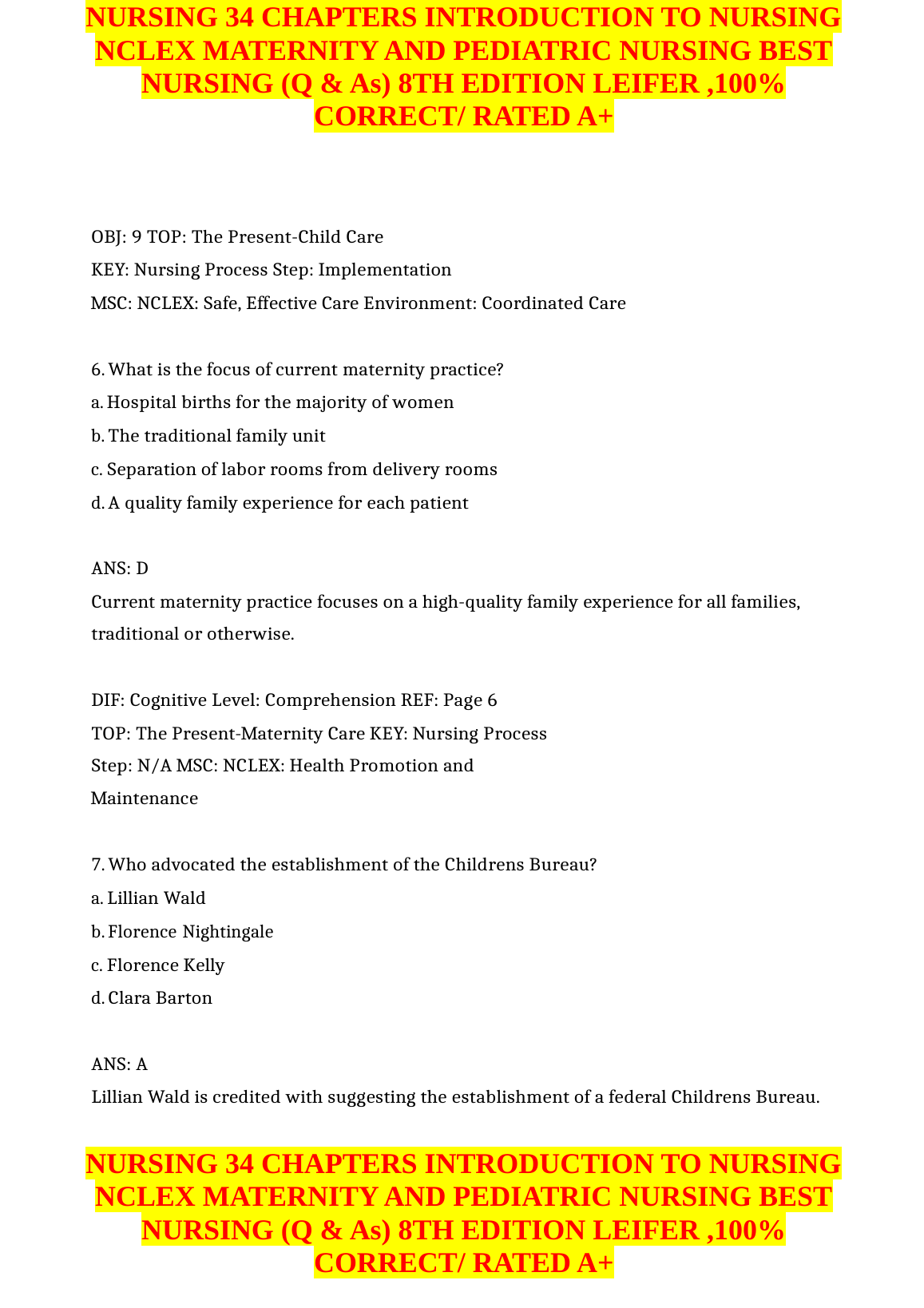 NURSING 34 CHAPTERS INTRODUCTION TO NURSING NCLEX MATERNITY AND PEDIATRIC NURSING BEST NURSING (Q & As) 8TH EDITION LEIFER ,100% CORRECT/ RATED A+. DOWNLOAD on www.hackedexams.com INSTANTLY.