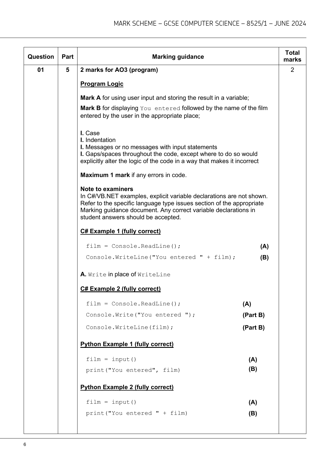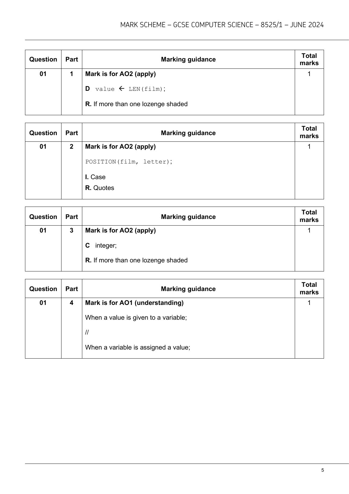 AQA GCSE COMPUTER SCIENCE Mark scheme Paper 1 2024 (8525/1A, 8525/1B, 8525/1C: Computational thinking and programming skills)