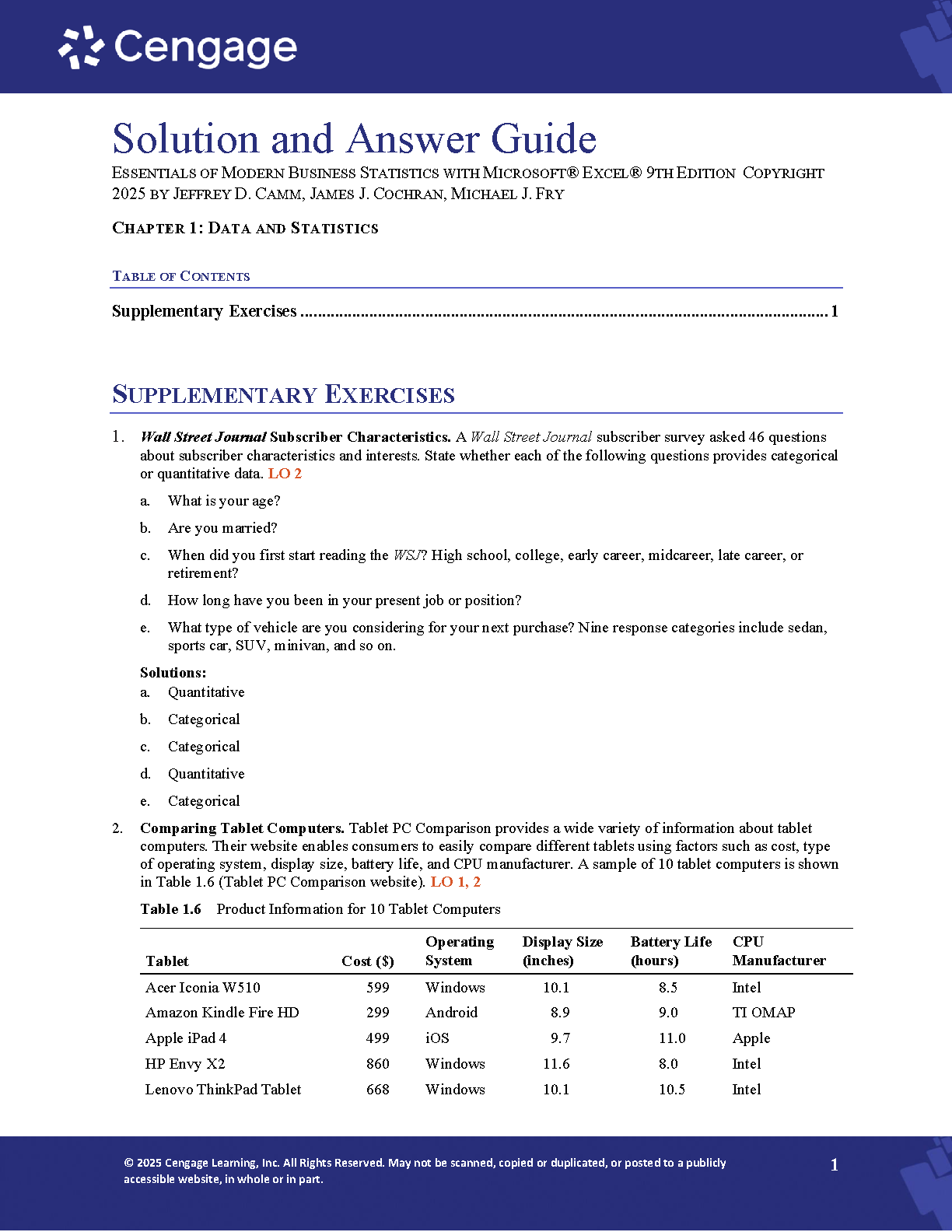 Essentials of Modern Business Statistics with Microsoft Excel, 9th Edition, Solution Manual by Jeffrey D. Camm, James J. Cochran, Michael J. Fry
