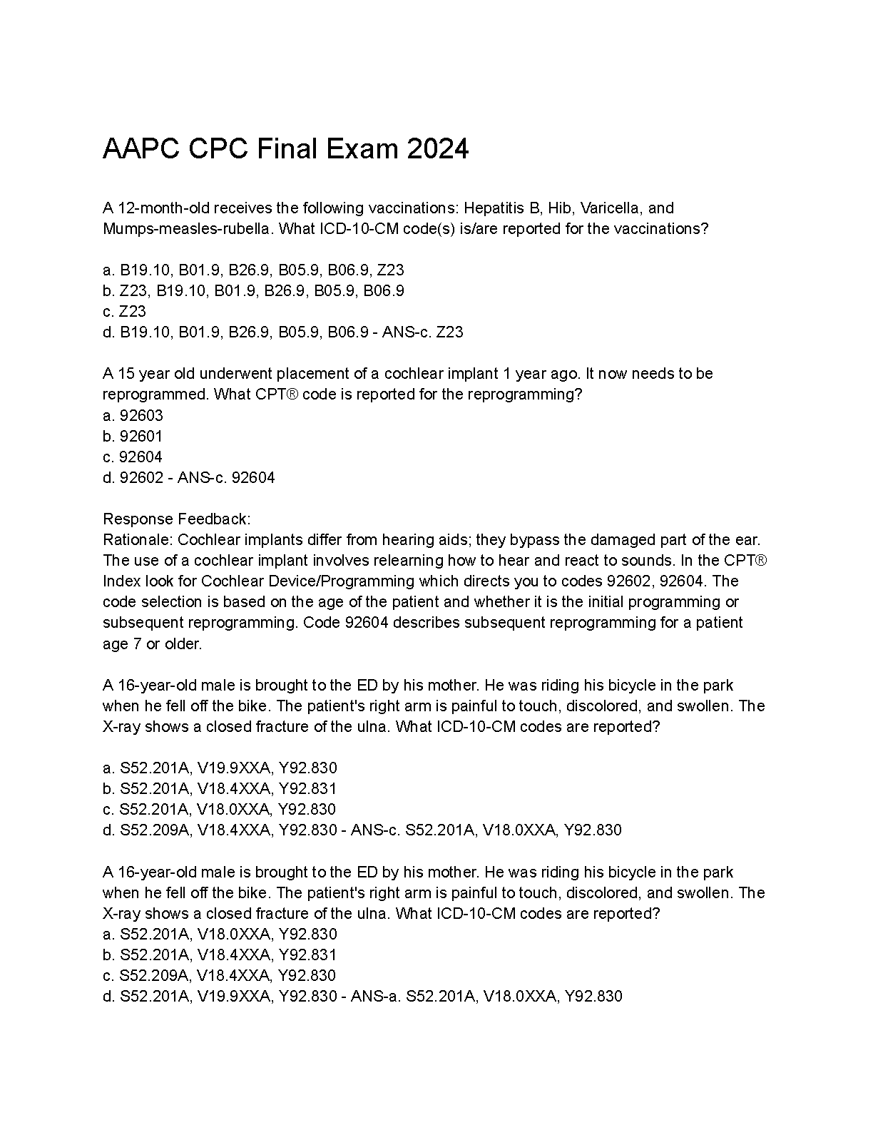 Prepare for the AAPC CPC Final Exam 2024 with this comprehensive resource. This practice exam includes questions and answers to help you master the material and pass on your first attempt.