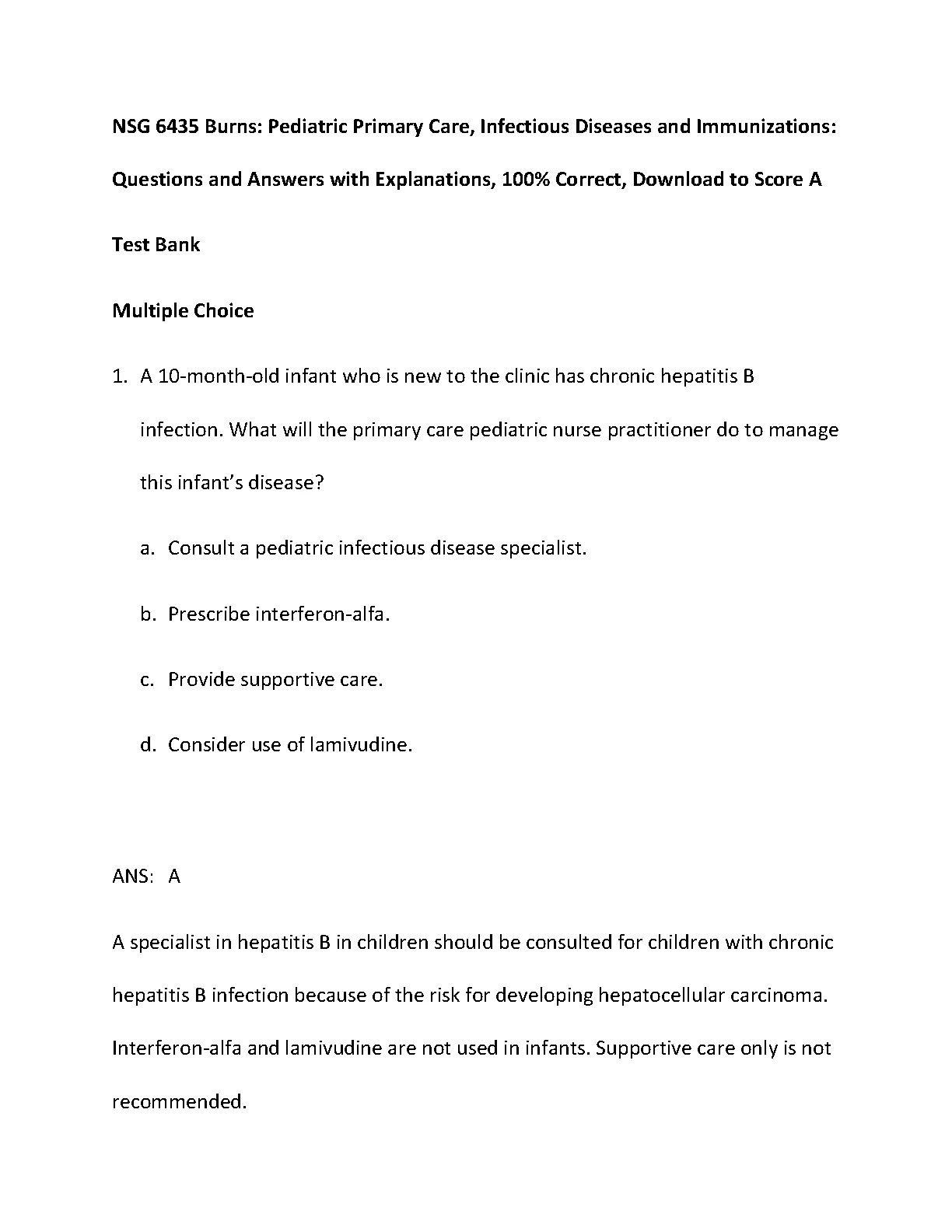 NSG 6435 Burns: Pediatric Primary Care, Infectious Diseases and Immunizations: Questions and Answers with Explanations, 100% Correct, Download to Score A Test Bank BRAND NEW SOLUTION 2023/2024. DOWNLOAD on www.hackedexams.com INSTANTLY.