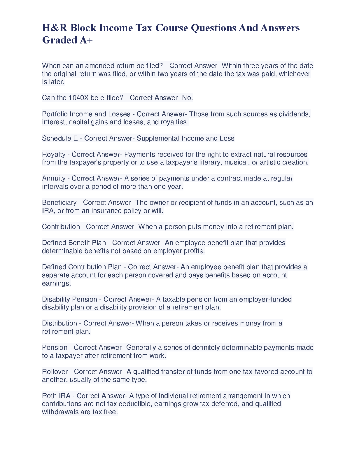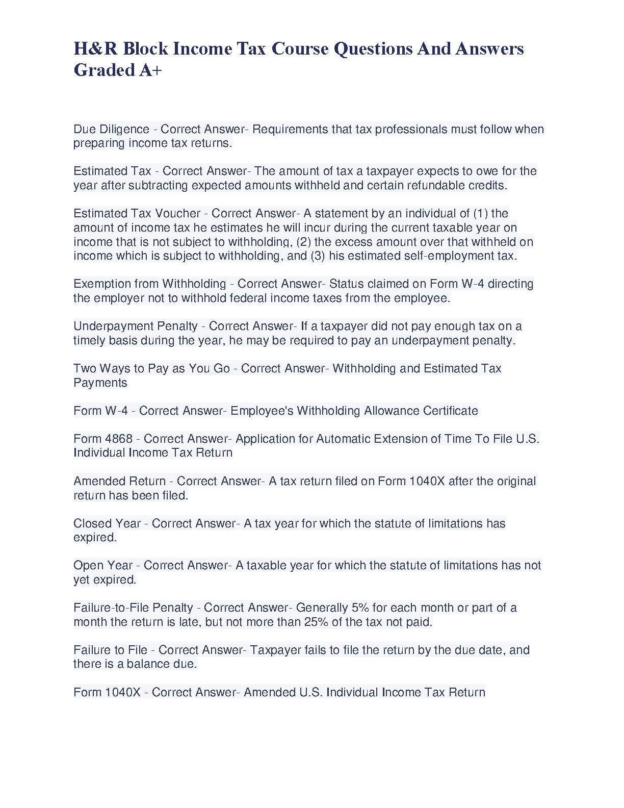 Ace your H&R Block Income Tax course with this comprehensive guide. This resource contains questions and answers graded A+, ensuring exam success on your first attempt. Prepare effectively and avoid resits with this invaluable study aid.