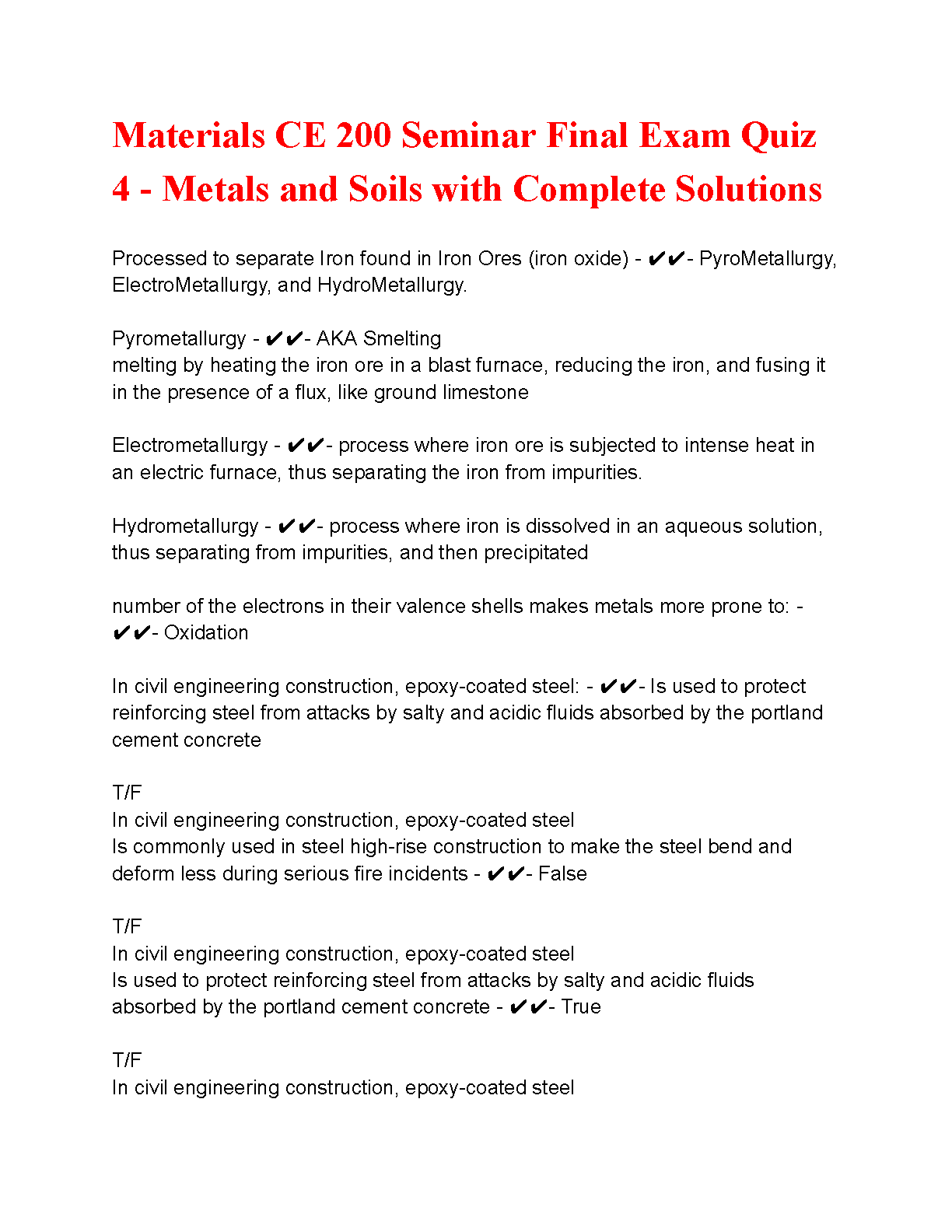 Materials CE 200 Seminar Final Exam Quiz 4 - Metals and Soils with Complete Solutions