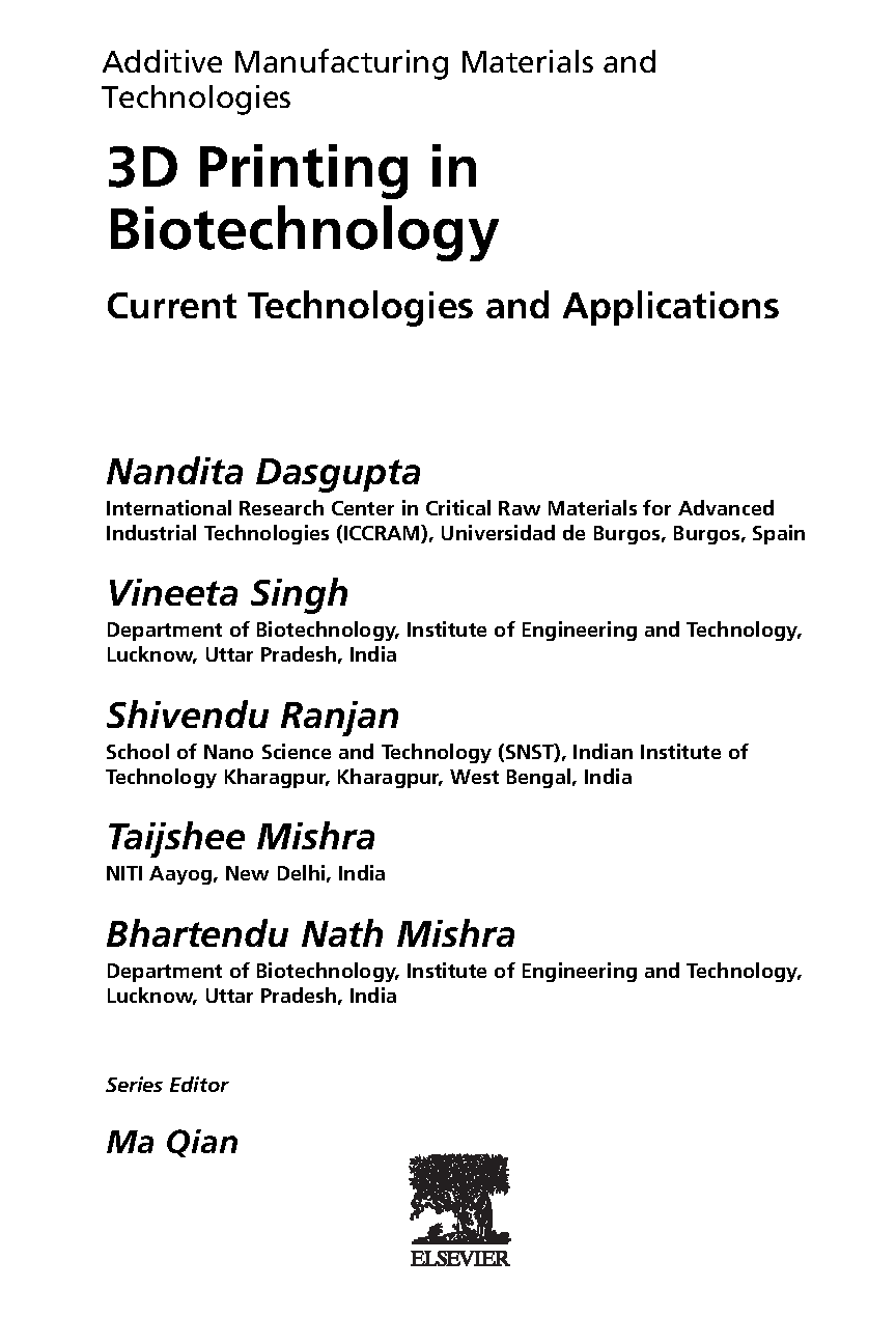 3D Printing in Biotechnology: Current Technologies and Applications by Nandita Dasgupta, Vineeta Singh, Shivendu Ranjan, Taijshee Mishra, and Bhartendu Nath Mishra
