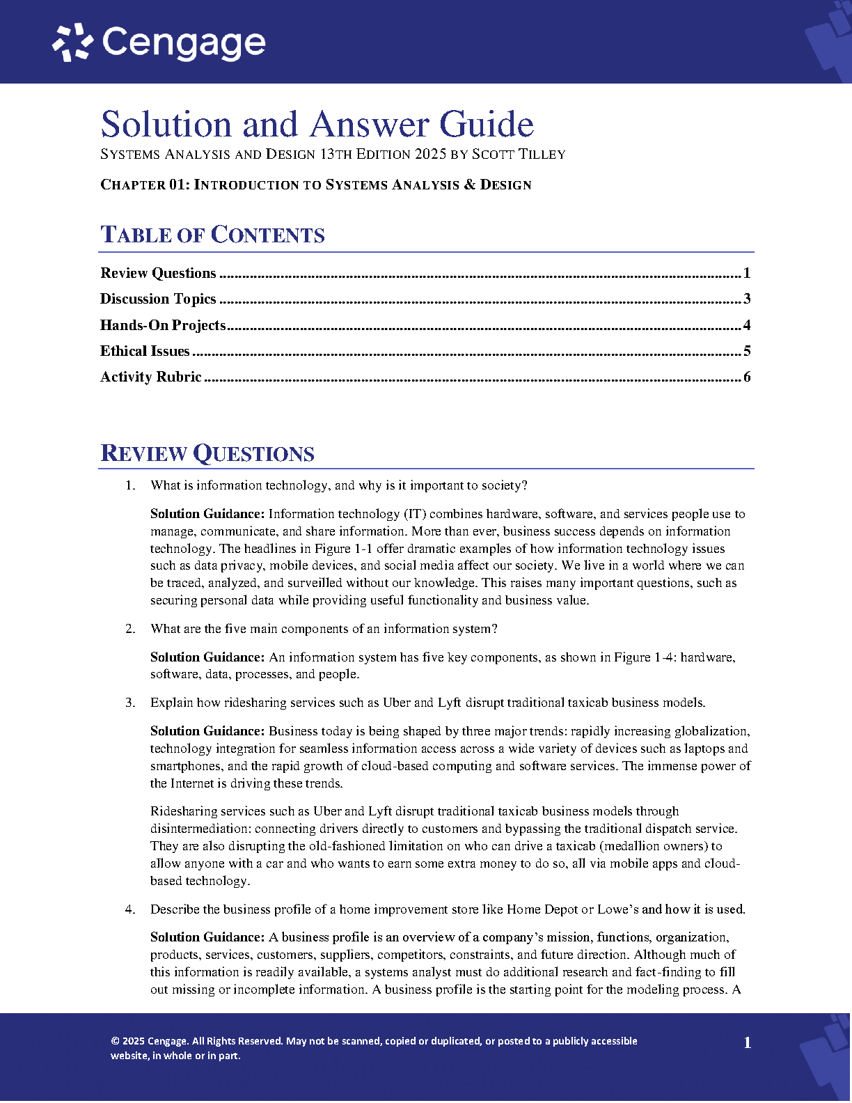 This comprehensive solution guide accompanies the 13th edition of "Systems Analysis and Design" by Scott Tilley. It provides detailed answers and explanations to all the review questions, enhancing understanding and improving exam performance. Perfect for students aiming to master the subject and ace their exams on the first try.