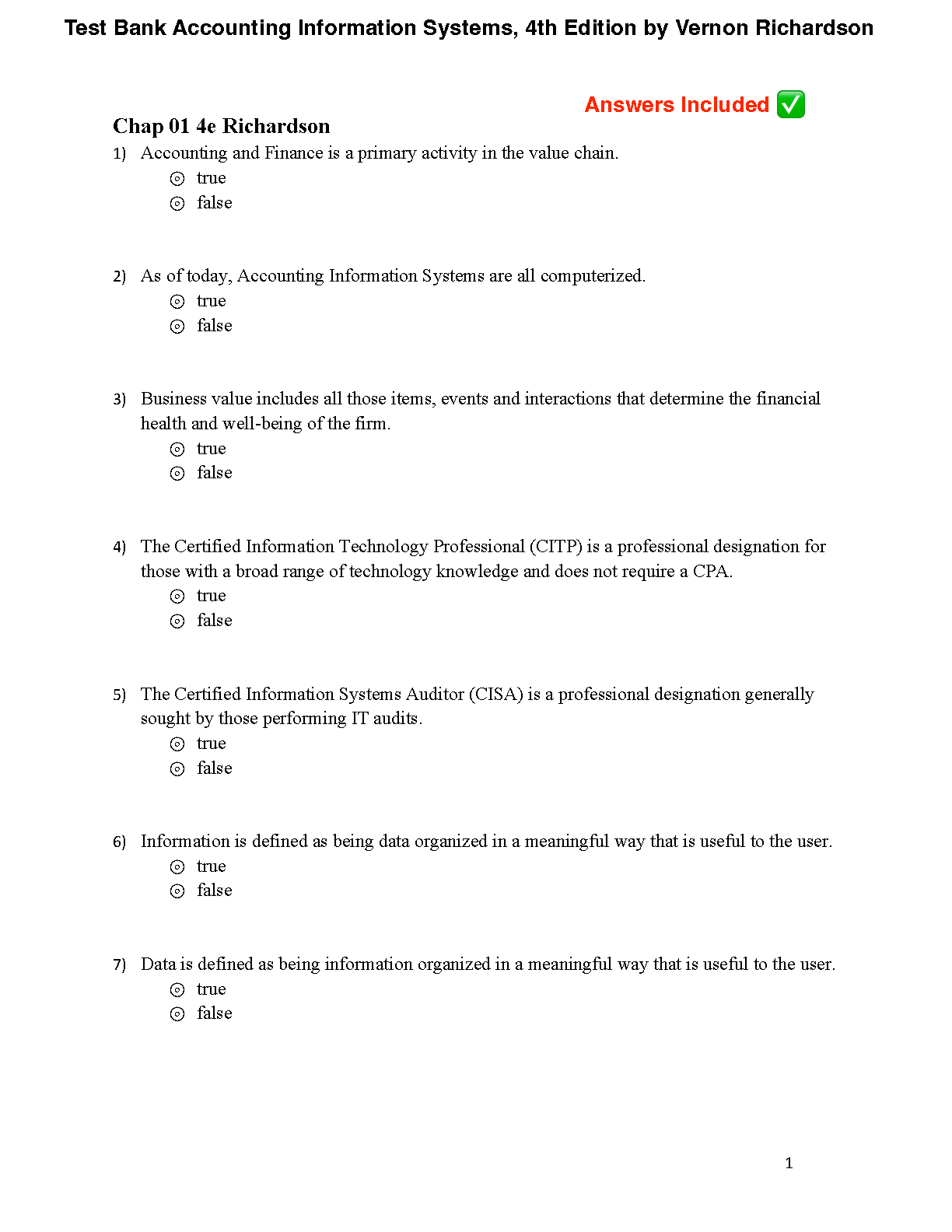 Accounting Information Systems Test Bank: 4th Edition by Vernon Richardson