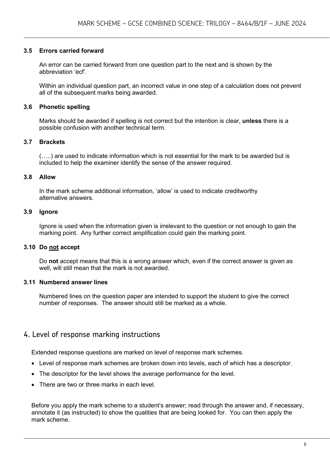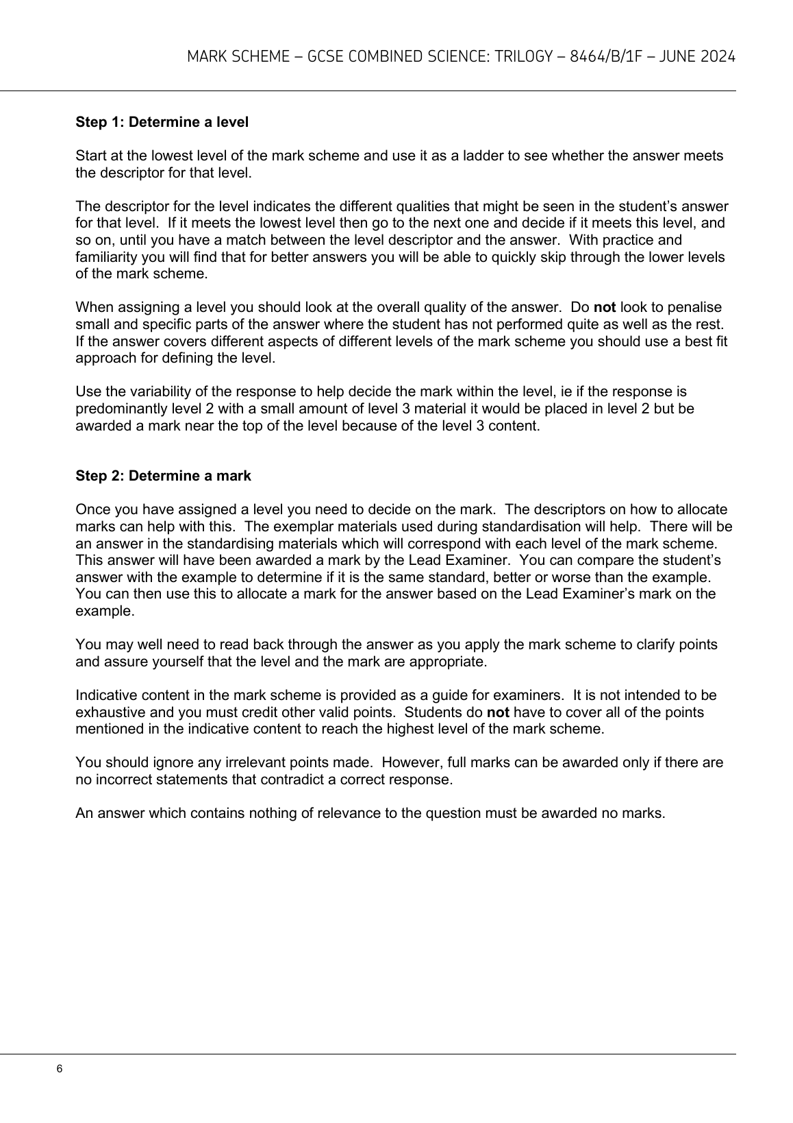 AQA GCSE COMBINED SCIENCE: TRILOGY Mark scheme Paper 1F 2024 (8464/B/1F: Biology)