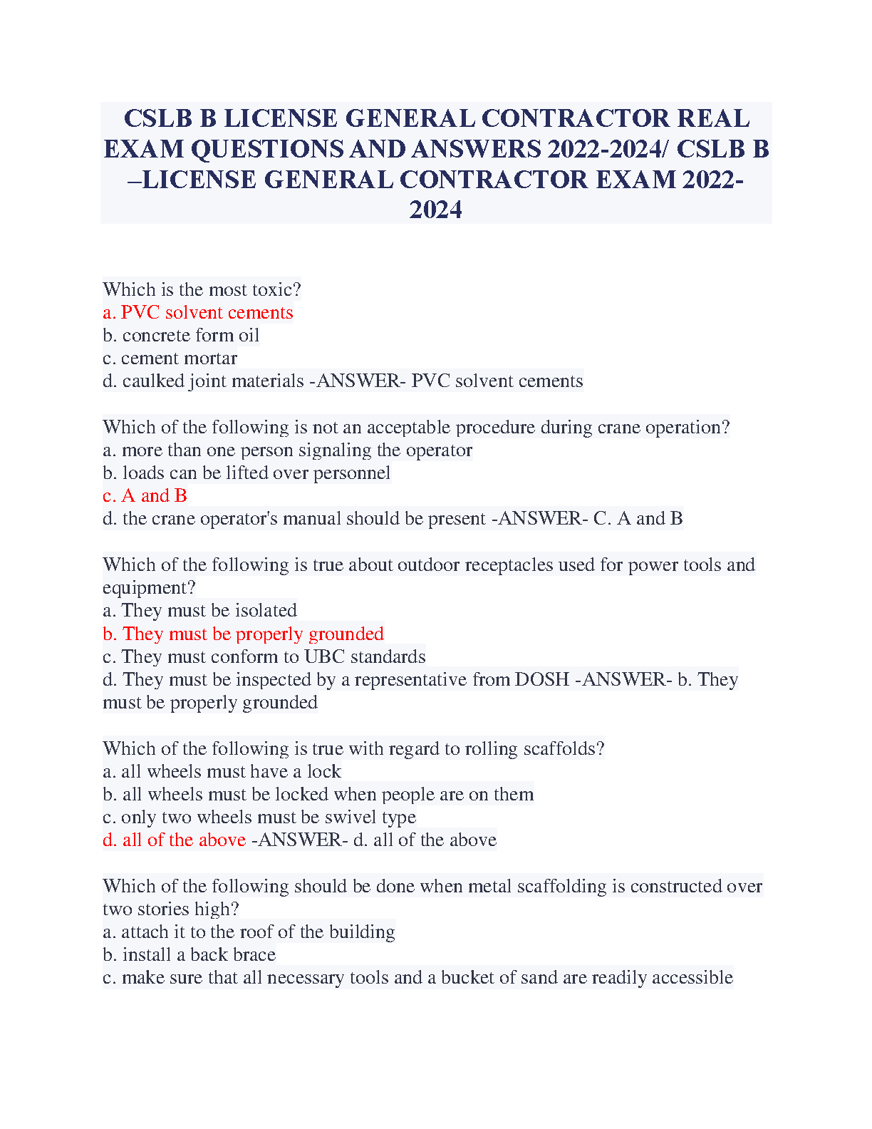CSLB B License General Contractor Real Exam Questions and Answers 2022-2024 Edition by Unknown Author