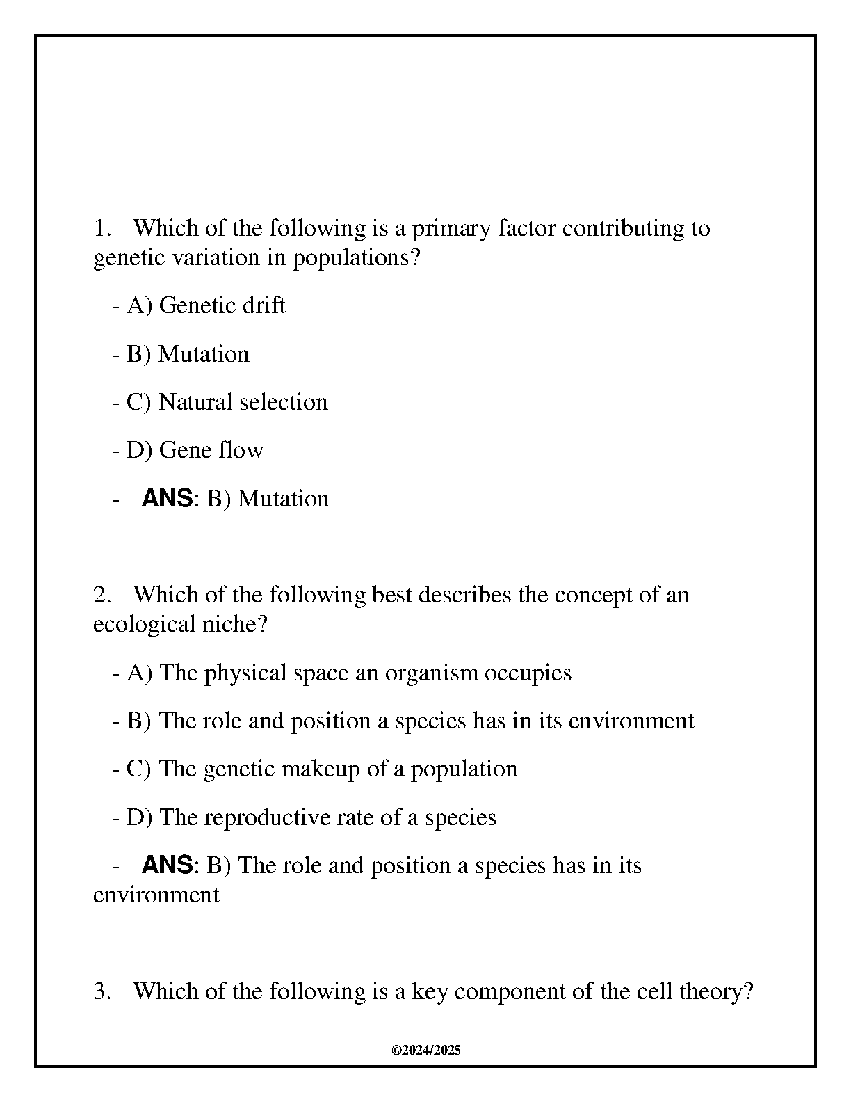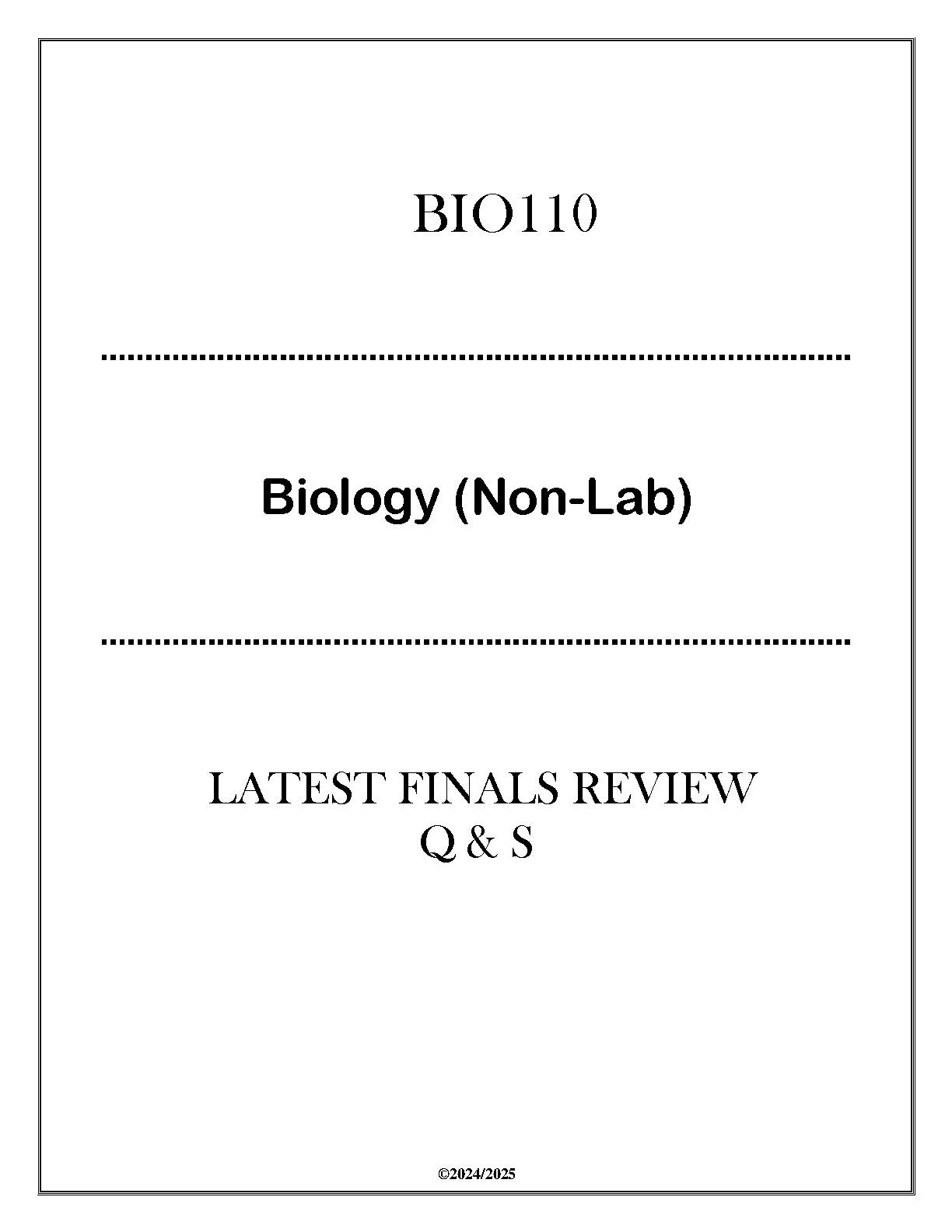 This comprehensive BIO110 Biology (Non-Lab) Finals Review is designed to help students ace their exams on the first attempt. The 2024/2025 edition contains up-to-date questions and answers, covering all key concepts to ensure exam success. Avoid resits and achieve your academic goals.