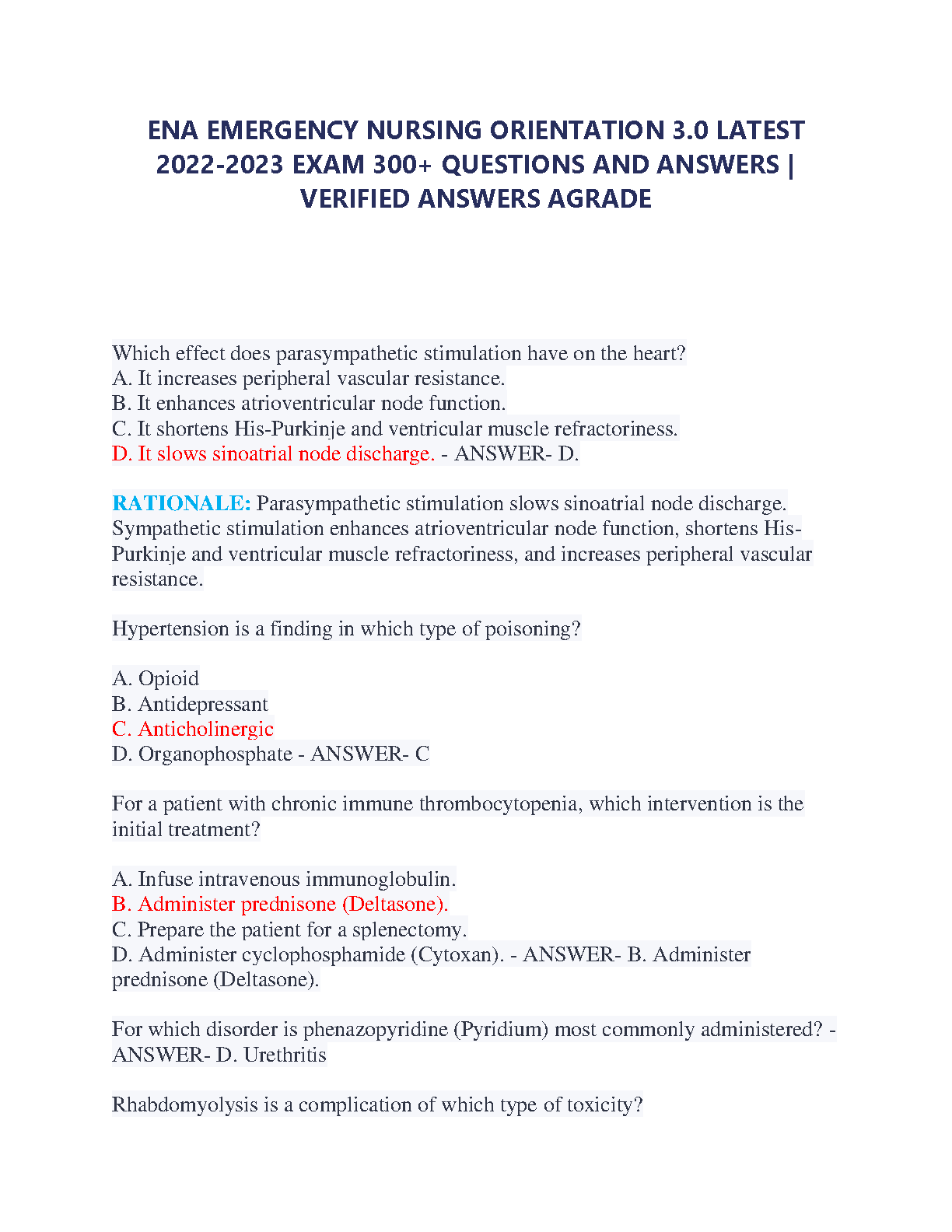 Ace your ENA Emergency Nursing Orientation 3.0 exam with this comprehensive question bank featuring 300+ verified answers. Prepare effectively and avoid resits with this latest 2022-2023 edition.