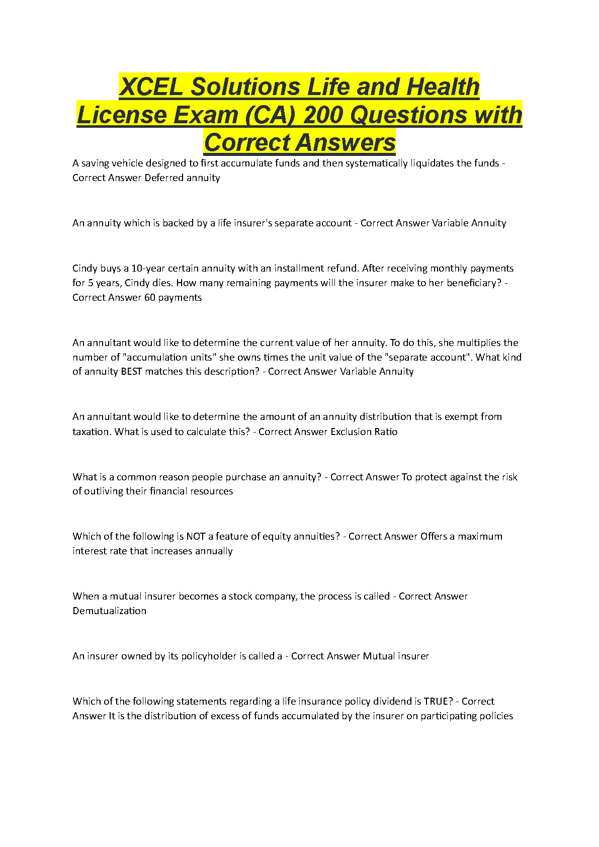 This resource contains 200 questions and answers for the XCEL Solutions Life and Health License Exam (CA). It's designed to help students pass their exams on the first try, avoiding costly resits. Ideal for exam preparation.