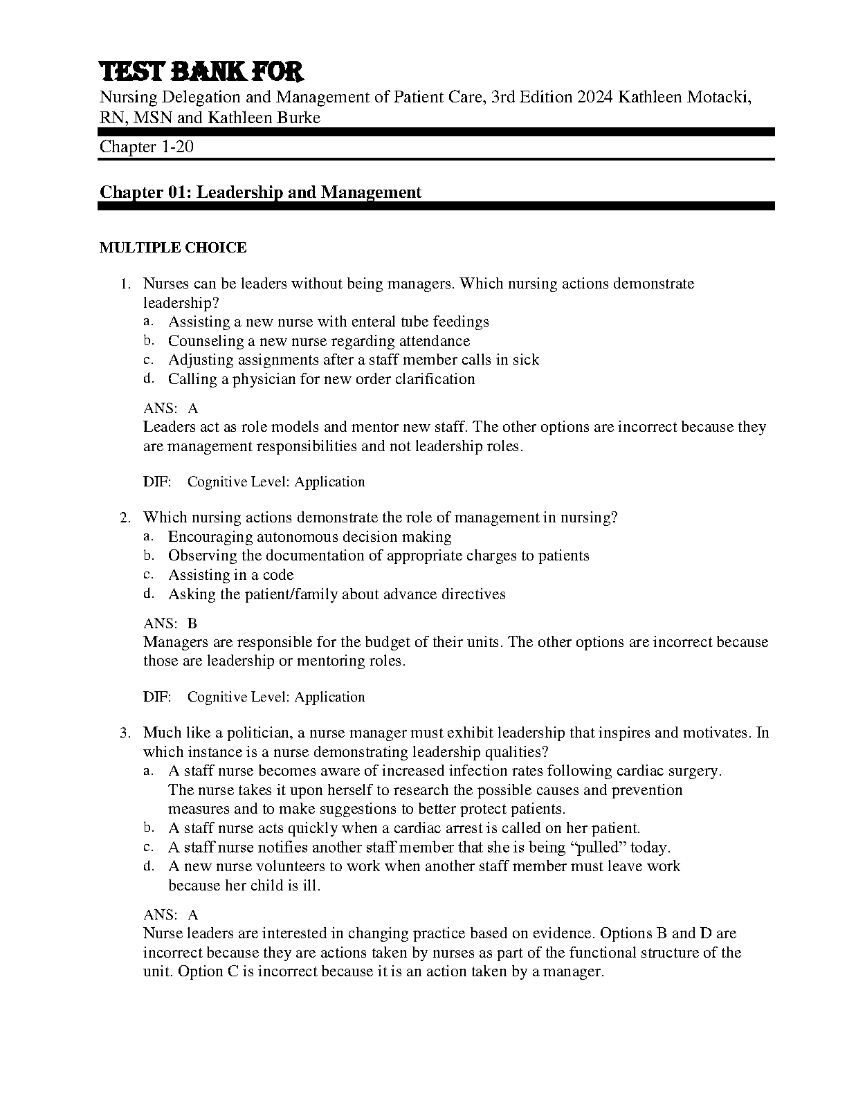 Nursing Delegation and Management of Patient Care, 3rd Edition 2024 Test Bank by Kathleen Motacki, RN, MSN and Kathleen Burke