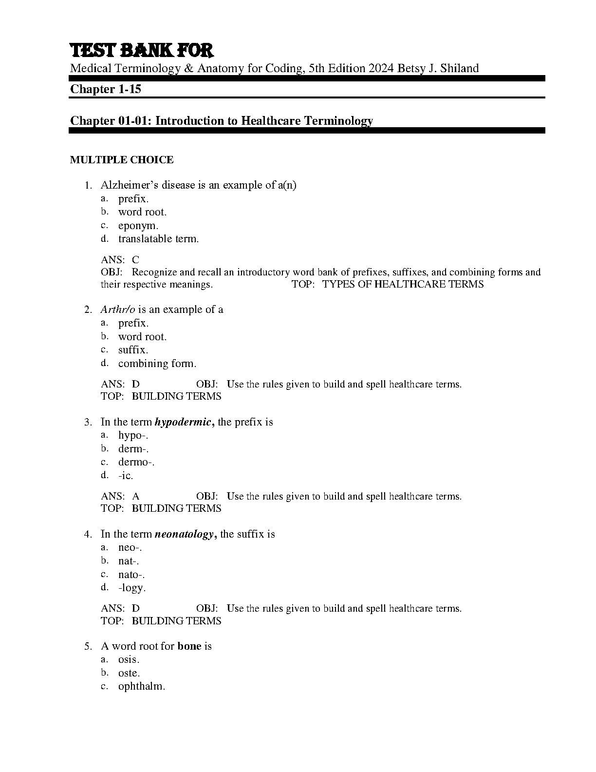 Ace your Medical Terminology & Anatomy for Coding exams with this comprehensive 5th edition test bank by Betsy J. Shiland. This resource is perfect for students aiming to pass on their first attempt, eliminating the need for resits. It covers key concepts and provides ample practice questions.