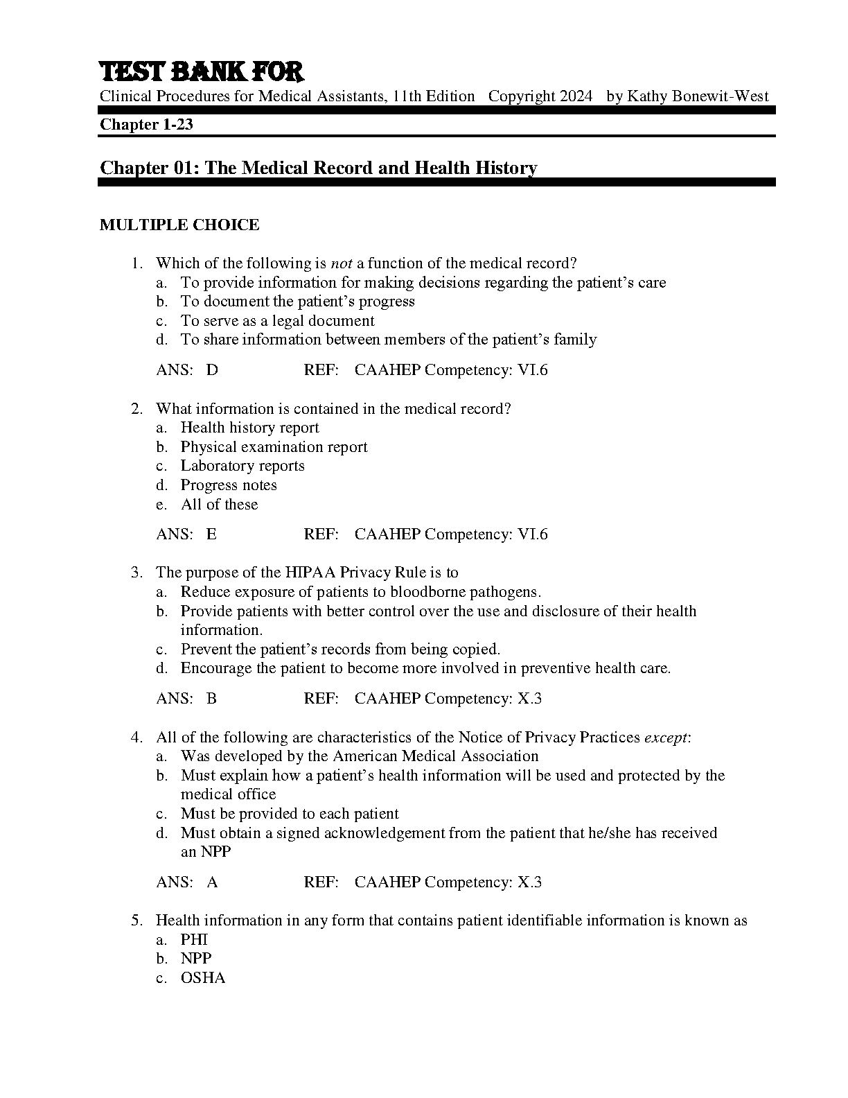 Test Bank for Clinical Procedures for Medical Assistants, 11th Edition by Kathy Bonewit-West and others