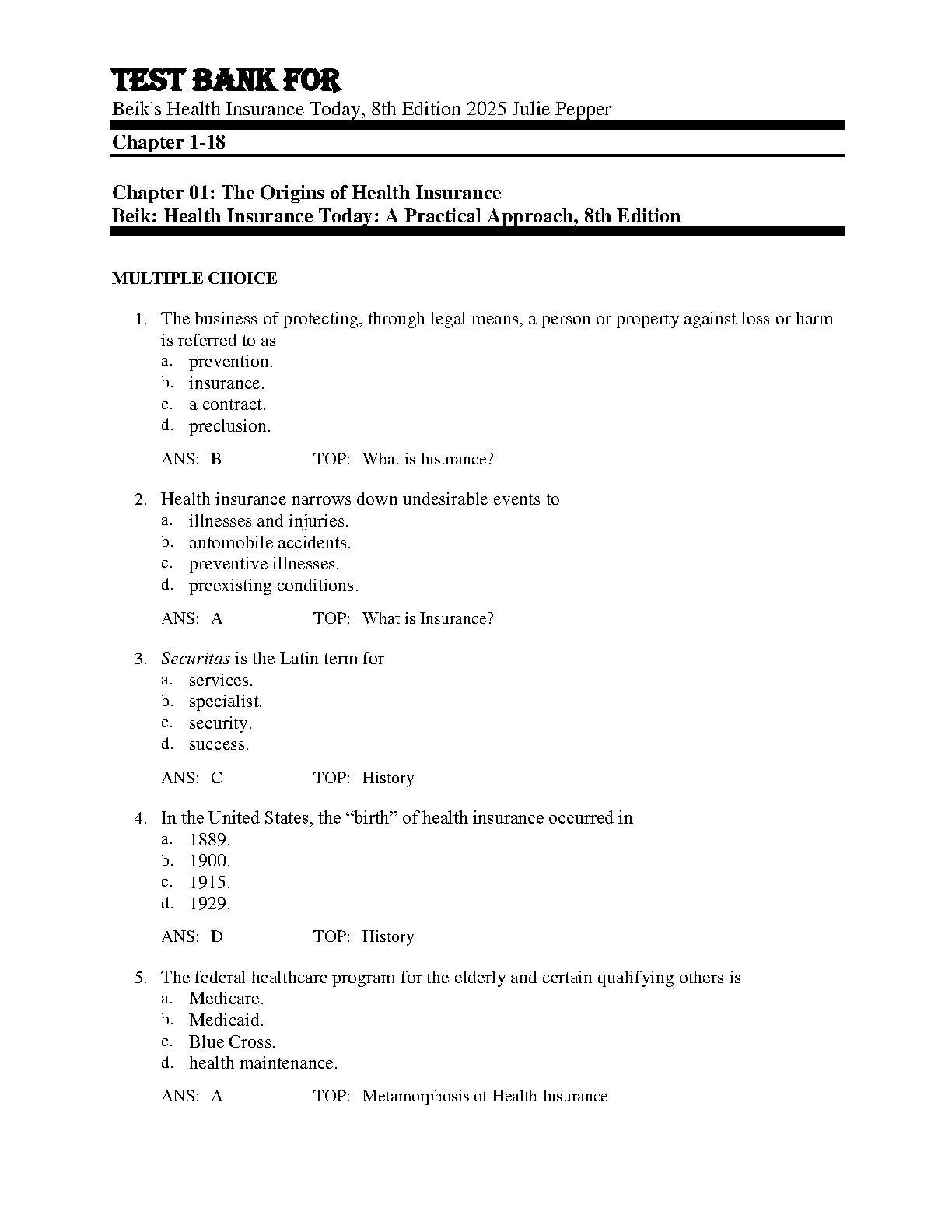 Test Bank for Beik's Health Insurance Today, 8th Edition 2025 by Julie Pepper and others