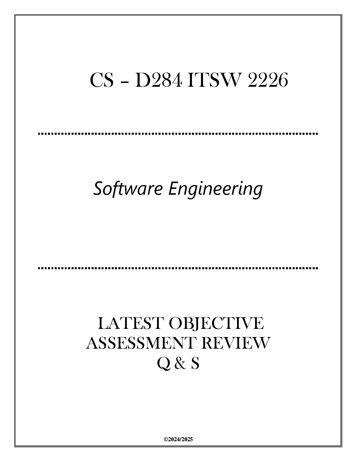 Ace your Software Engineering exams with this comprehensive 2024/2025 objective assessment review. This resource is designed to help students pass on their first attempt, avoiding resits. It's perfect for students in CS-D284 and ITSW 2226 courses.