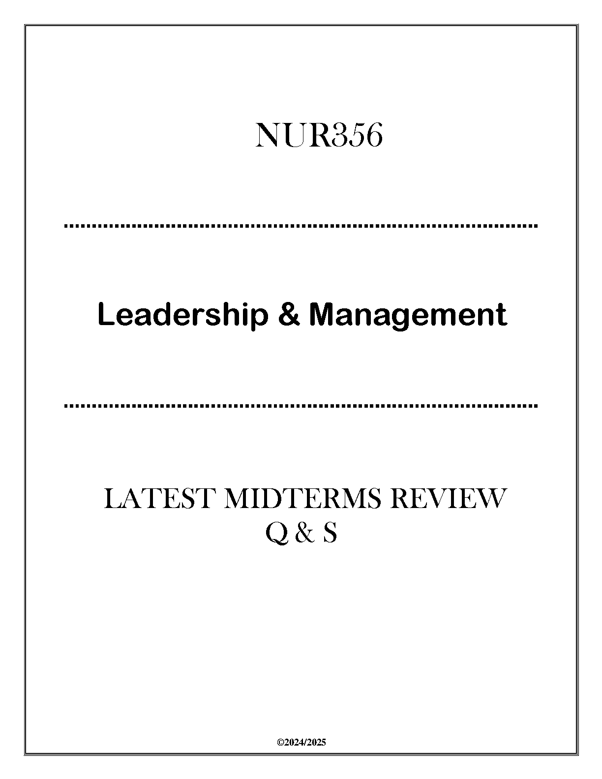 Ace your NUR356 Leadership & Management midterm exam with this comprehensive 2024/2025 review guide. Get the questions and answers you need to pass on your first try and avoid resits. Designed for success!