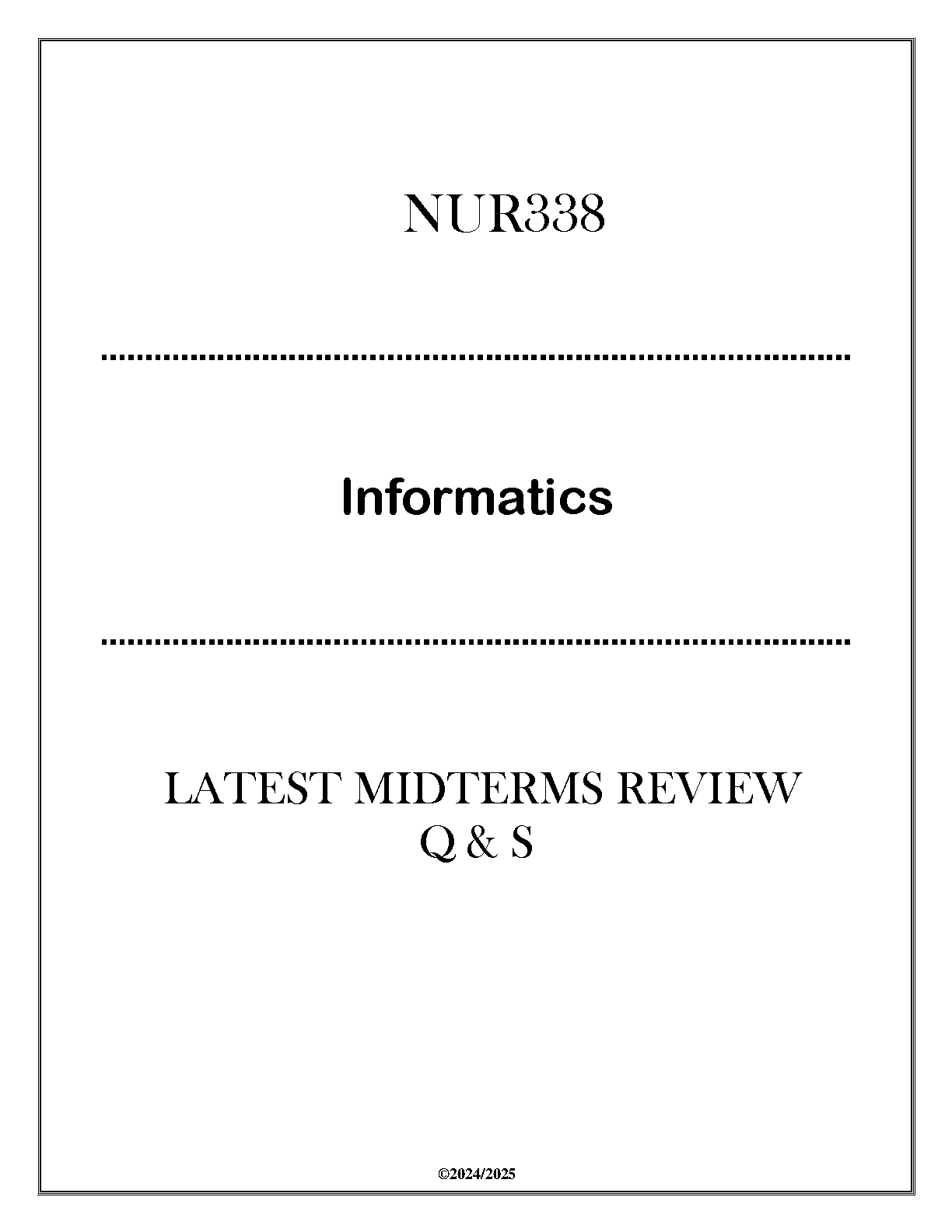 Ace your NUR338 Informatics midterm exam on your first attempt with this comprehensive study guide. This latest 2024/2025 edition provides questions and answers designed to help students master the material and avoid resits.