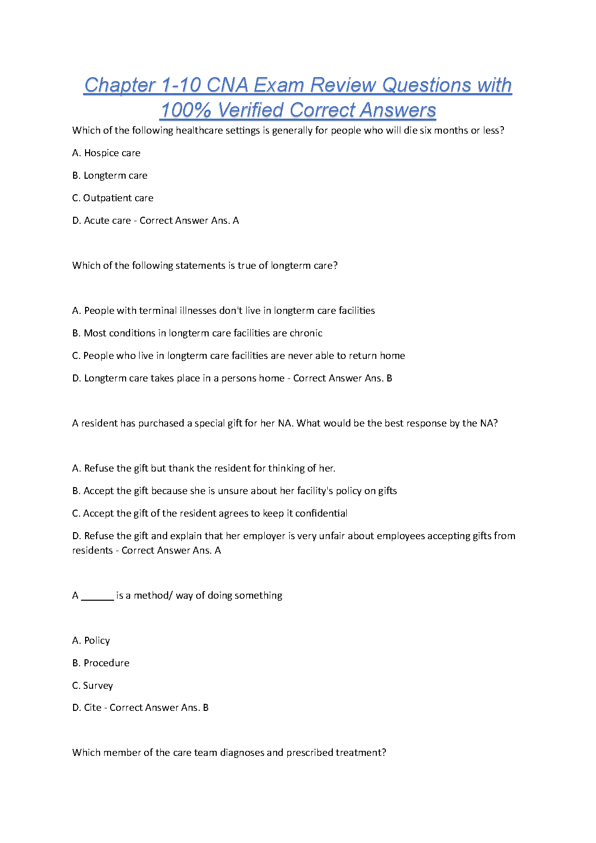 CNA Exam Review Questions with 100% Verified Correct Answers: A Comprehensive Guide for Success