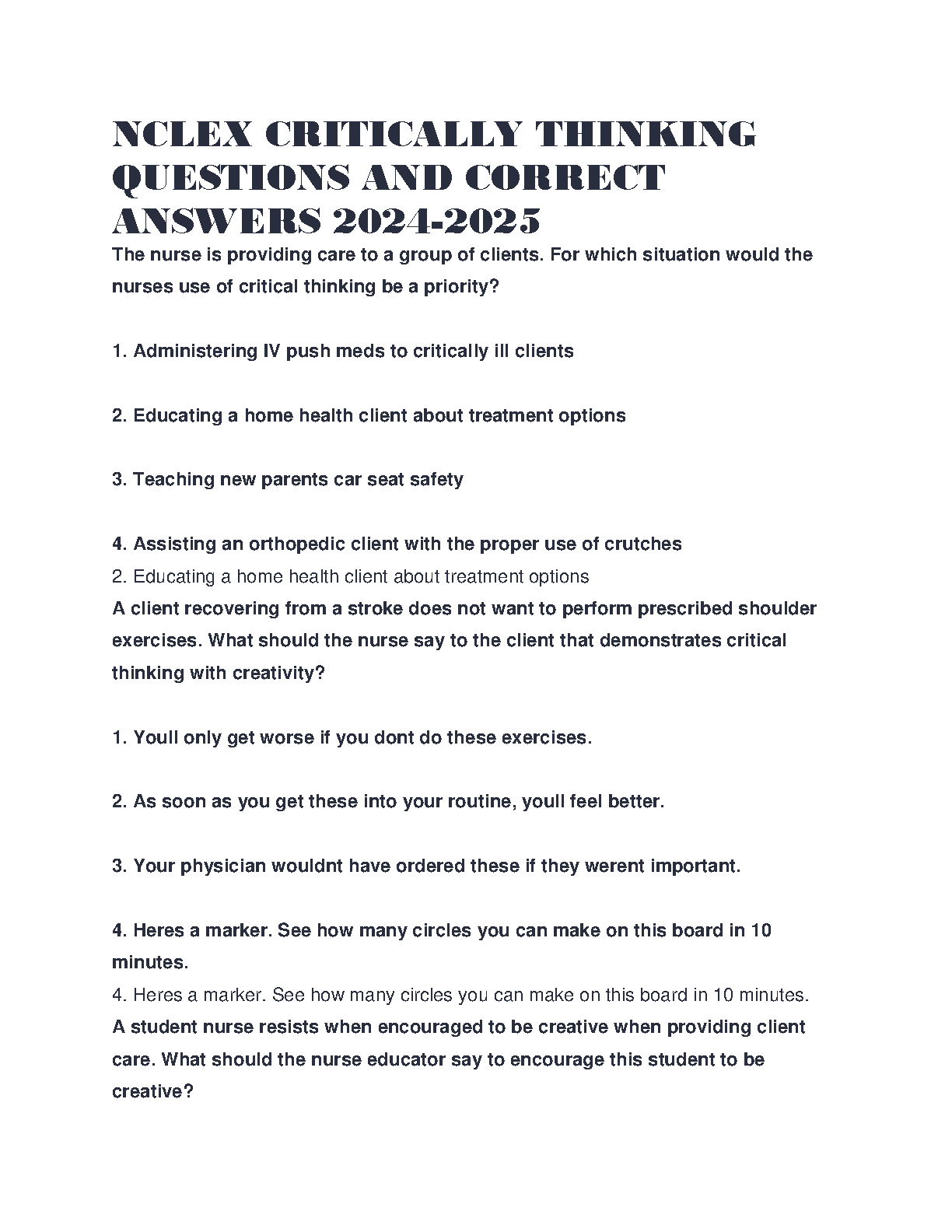 Ace your NCLEX exam with this comprehensive guide to critically thinking questions and answers. Designed for the 2024-2025 academic year, this resource helps nursing students master critical thinking skills and pass their exams on the first attempt, avoiding costly resits.