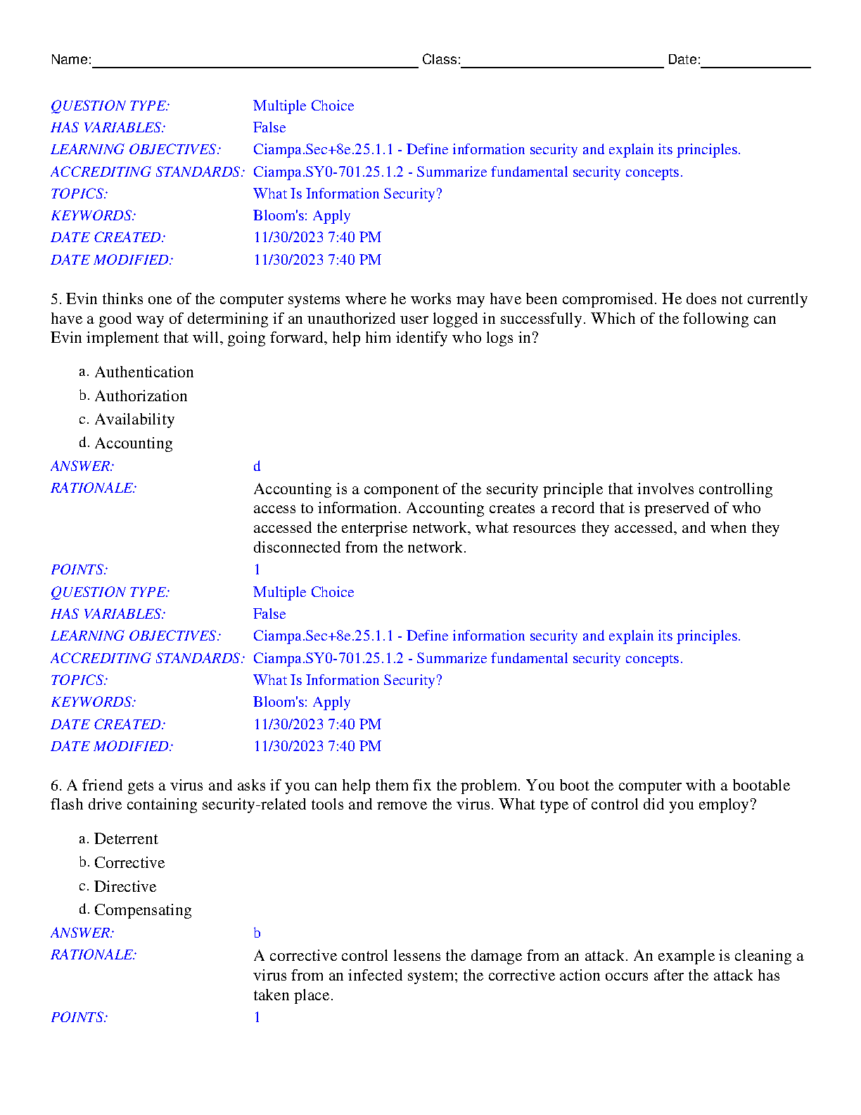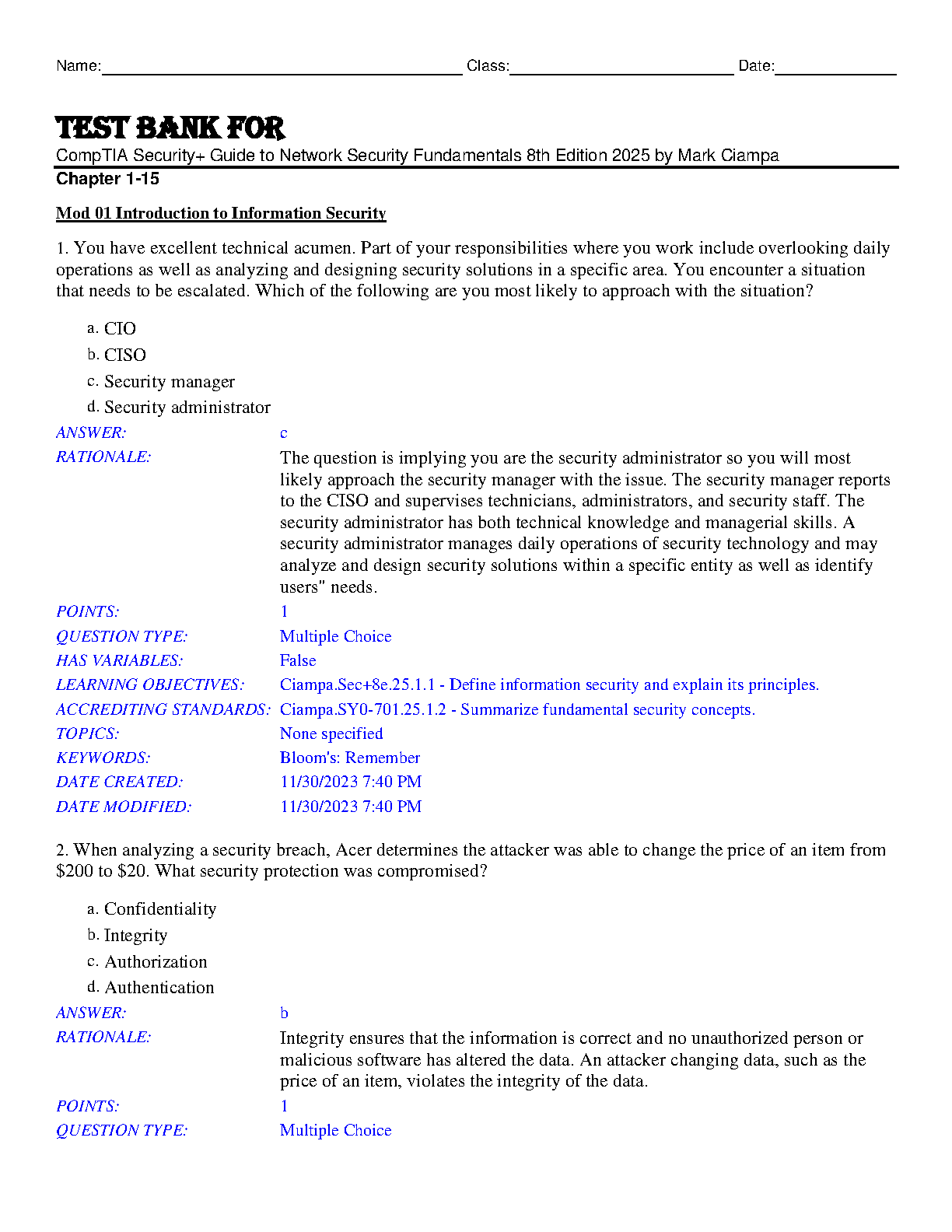 This comprehensive test bank, created by Mark Ciampa, offers a robust collection of questions and answers covering all aspects of CompTIA Security+ Guide to Network Security Fundamentals, 8th Edition. Prepare effectively for exams and improve your understanding of key concepts.