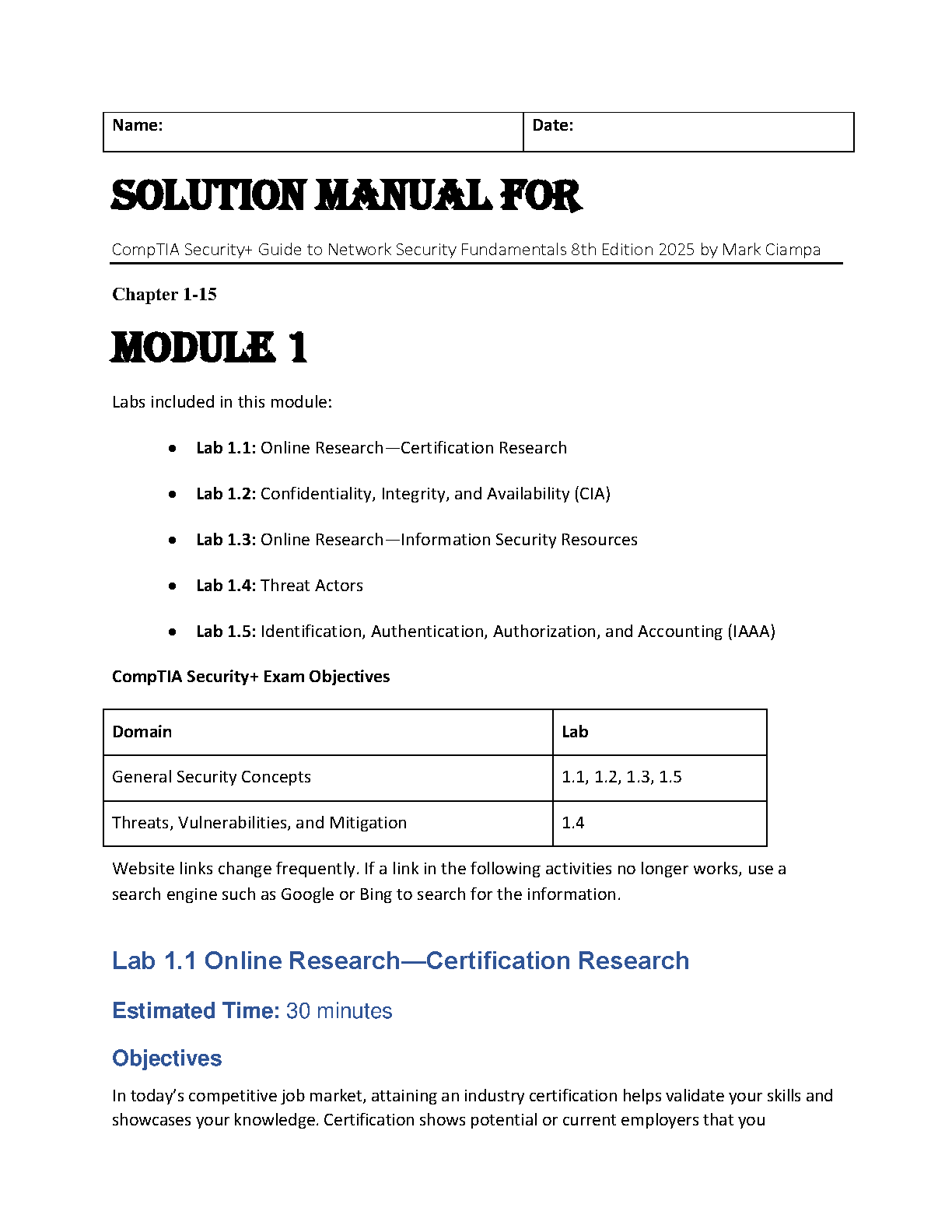 CompTIA Security+ Guide to Network Security Fundamentals 8th Edition 2025 Solution Manual by Mark Ciampa