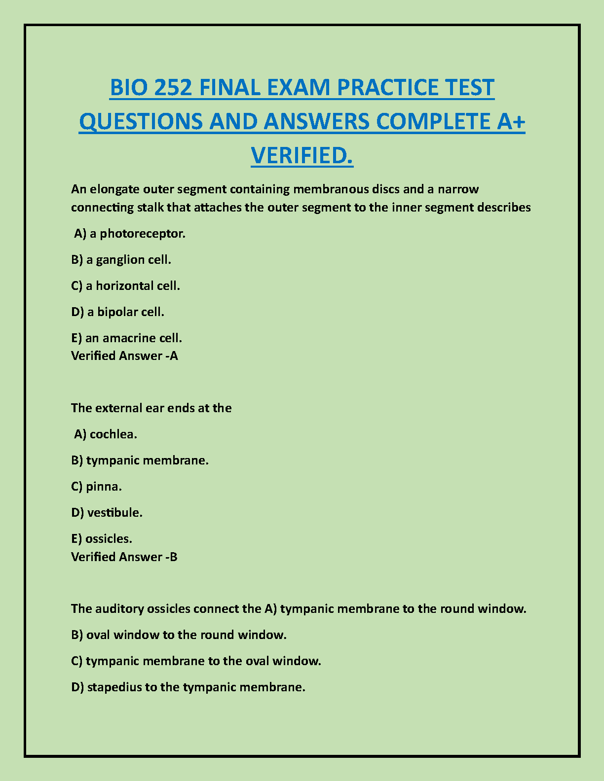 Ace your BIO 252 final exam with this comprehensive practice test featuring verified questions and answers. Designed to help students pass on their first attempt, this resource covers key concepts and ensures exam readiness. Perfect for 2024/2025 academic year.