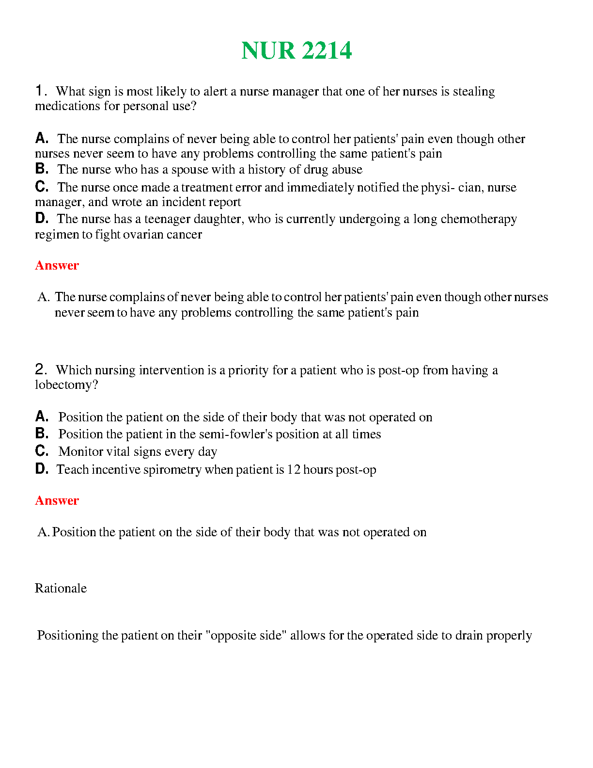 NUR 2214 Exam Prep: Ace Your Nursing Exams with Latest Questions and Answers for 2024-2025