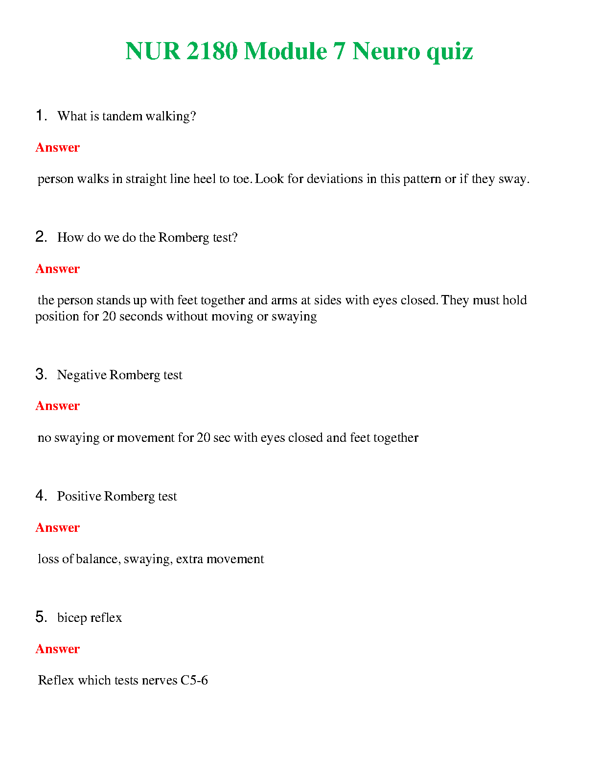 Ace your NUR 2180 Neuro exam with this concise and effective study guide. This resource covers key concepts, including tandem walking, Romberg test variations, and bicep reflex. Master the material and confidently achieve your academic goals.