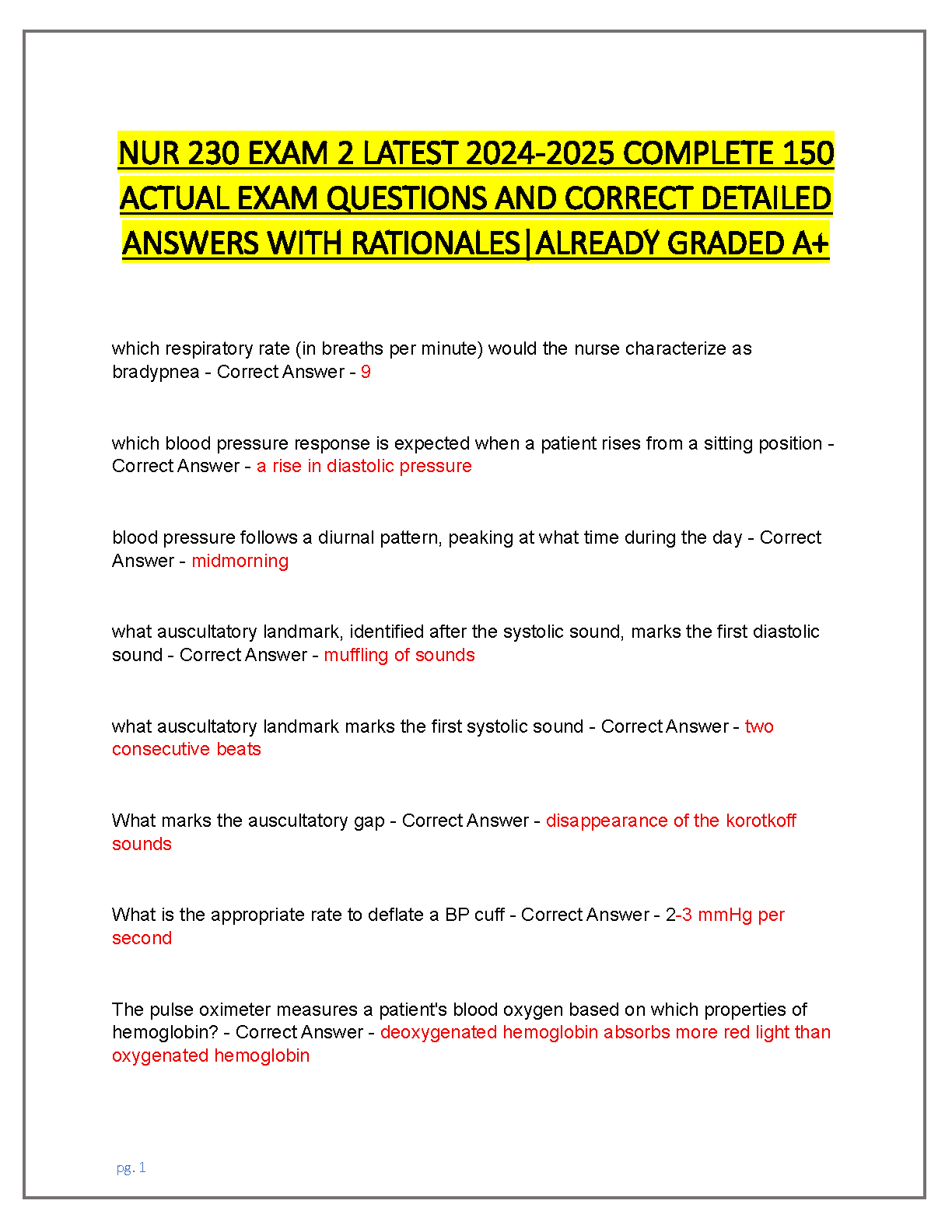Ace your NUR 230 Exam 2 with this comprehensive study guide featuring 150 actual exam questions and detailed rationales. This updated 2024-2025 edition is designed to help you pass on your first attempt and avoid resits. Already graded A+!
