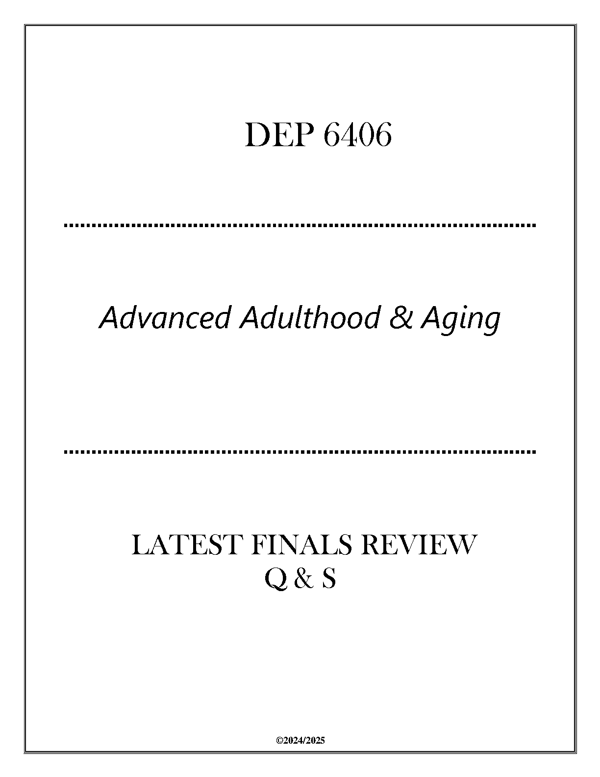 Ace your DEP 6406 Advanced Adulthood & Aging final exam on your first attempt with this comprehensive question and answer review guide. Designed for the 2024/2025 academic year, this resource provides the latest information and practice questions to help you succeed.