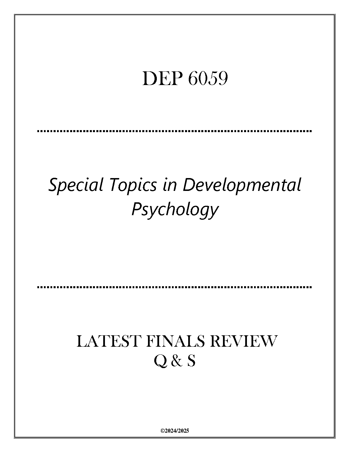 Ace your DEP 6059 Special Topics in Developmental Psychology final exam with this comprehensive 2024-2025 review guide. This resource is designed to help students pass their exams on the first attempt, ensuring success and avoiding resits. Prepare effectively for your finals.