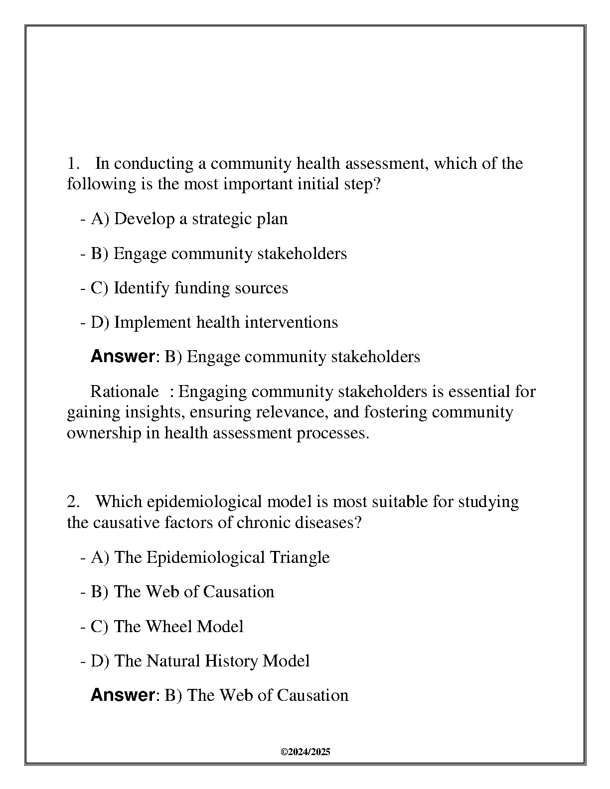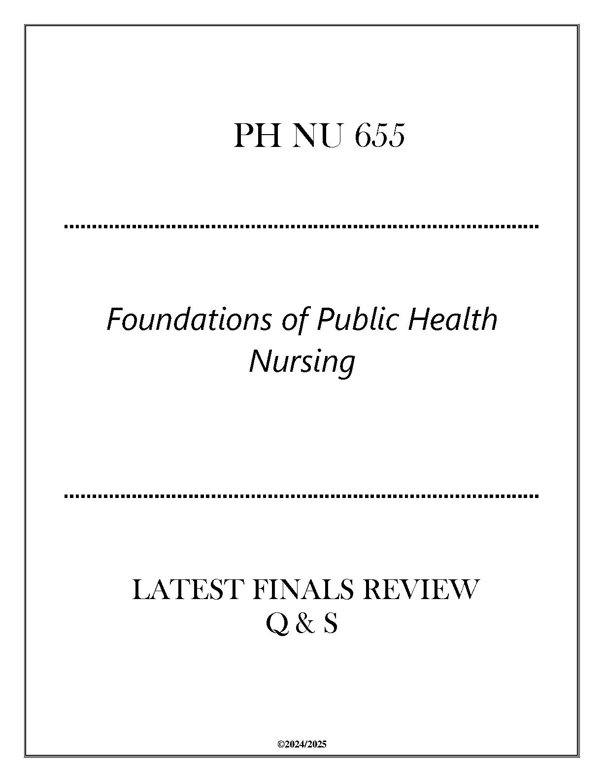 Ace your PHNU 655 Foundations of Public Health Nursing final exam with this comprehensive review guide. This resource is designed to help students achieve success on their first attempt, eliminating the need for resits. Prepare effectively for the exam with detailed questions and answers covering all essential topics.