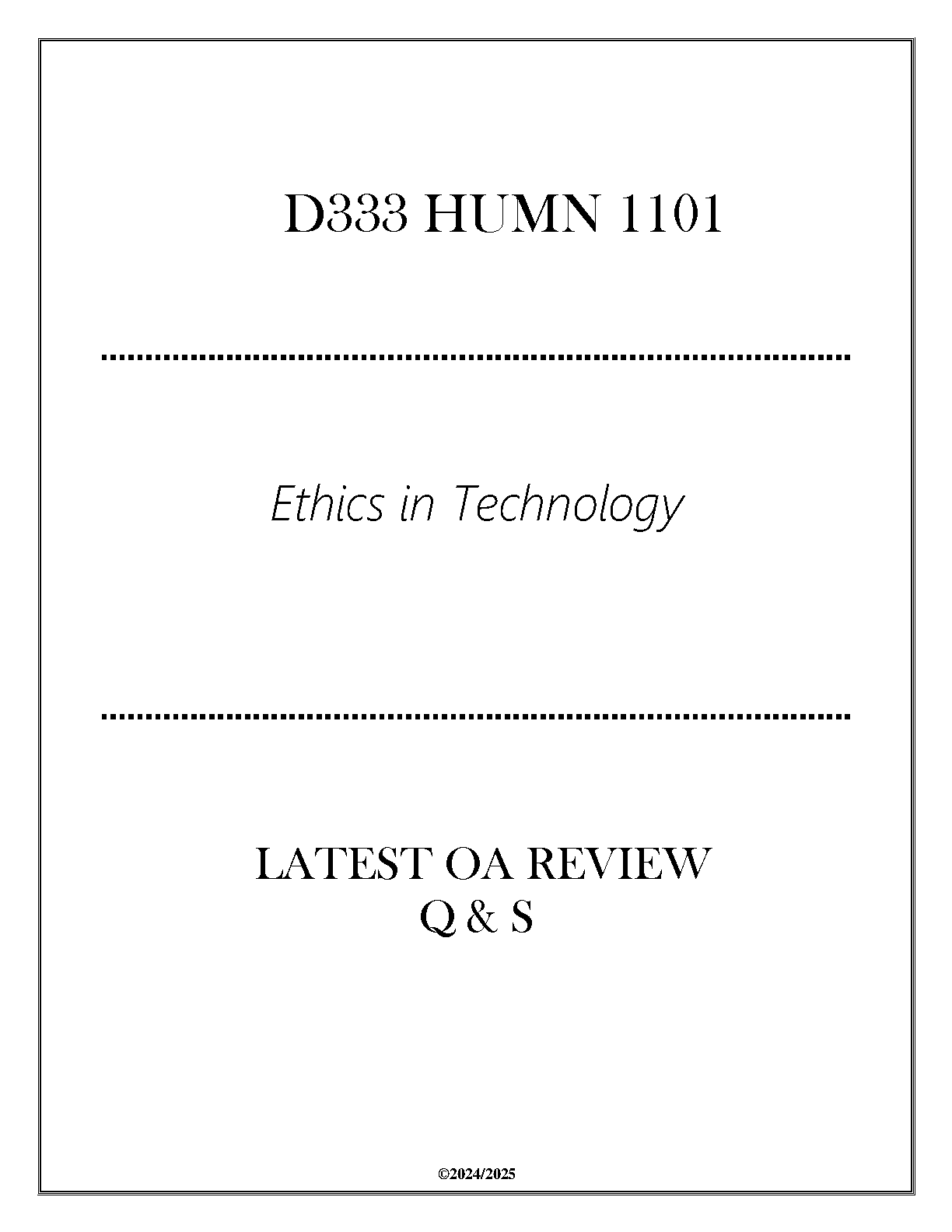 Ace your D333 HUMN 1101 Ethics in Technology exam with this comprehensive 2024-2025 OA review. This resource is designed to help students achieve first-time exam success and avoid resits. Prepare effectively and boost your confidence.