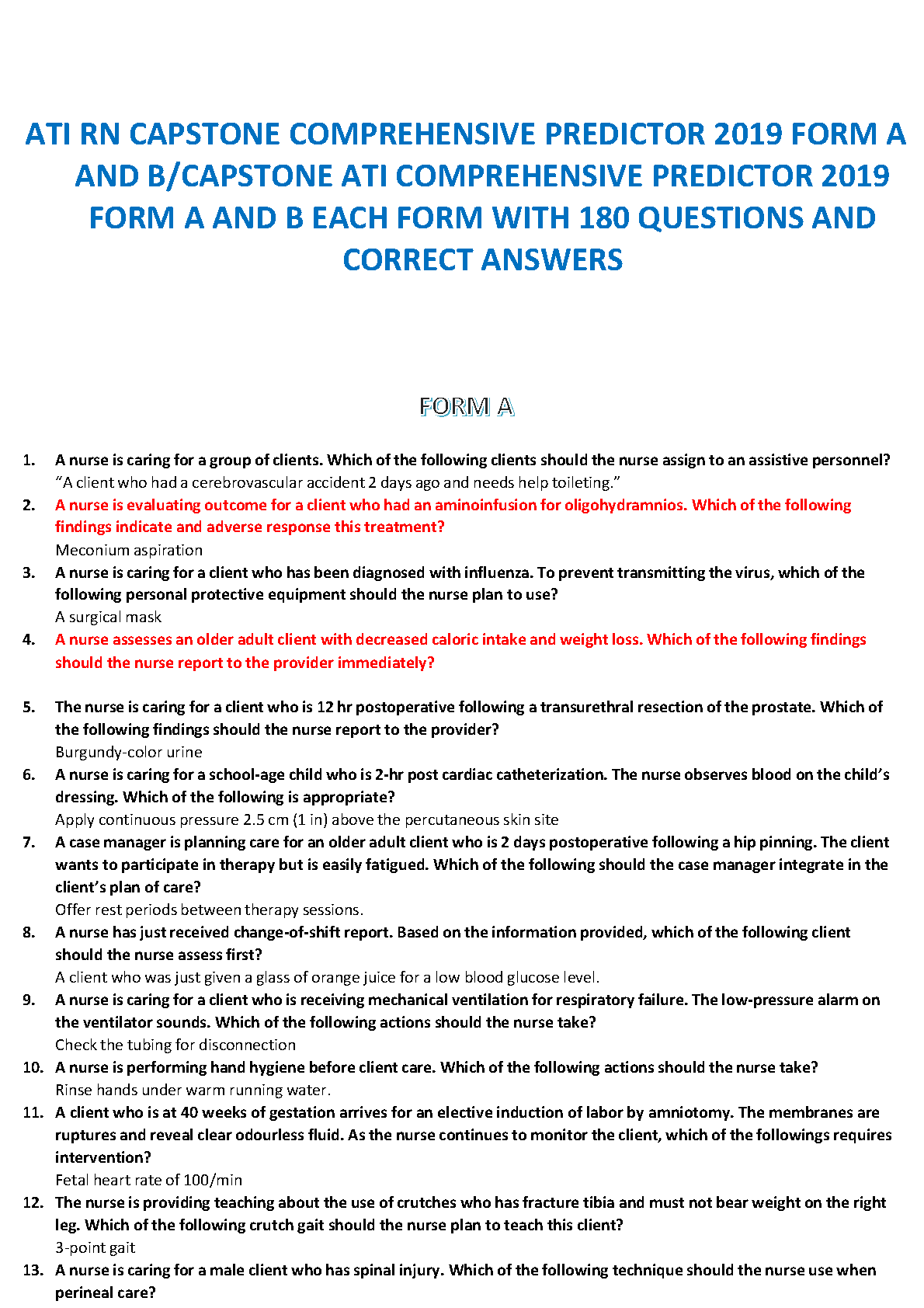 ATI RN Capstone Comprehensive Predictor 2019 Forms A and B: 180 Questions and Correct Answers by ATI