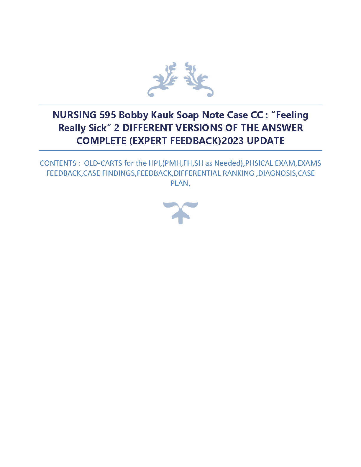 Ace your NURSING 595 exams with this comprehensive case study solution. This 2024/2025 updated resource provides two different versions of the answer to the "Feeling Really Sick" case, complete with expert feedback, OLD-CARTS for HPI, physical exam findings, differential diagnosis, and case plan. Ensure exam success on your first try.