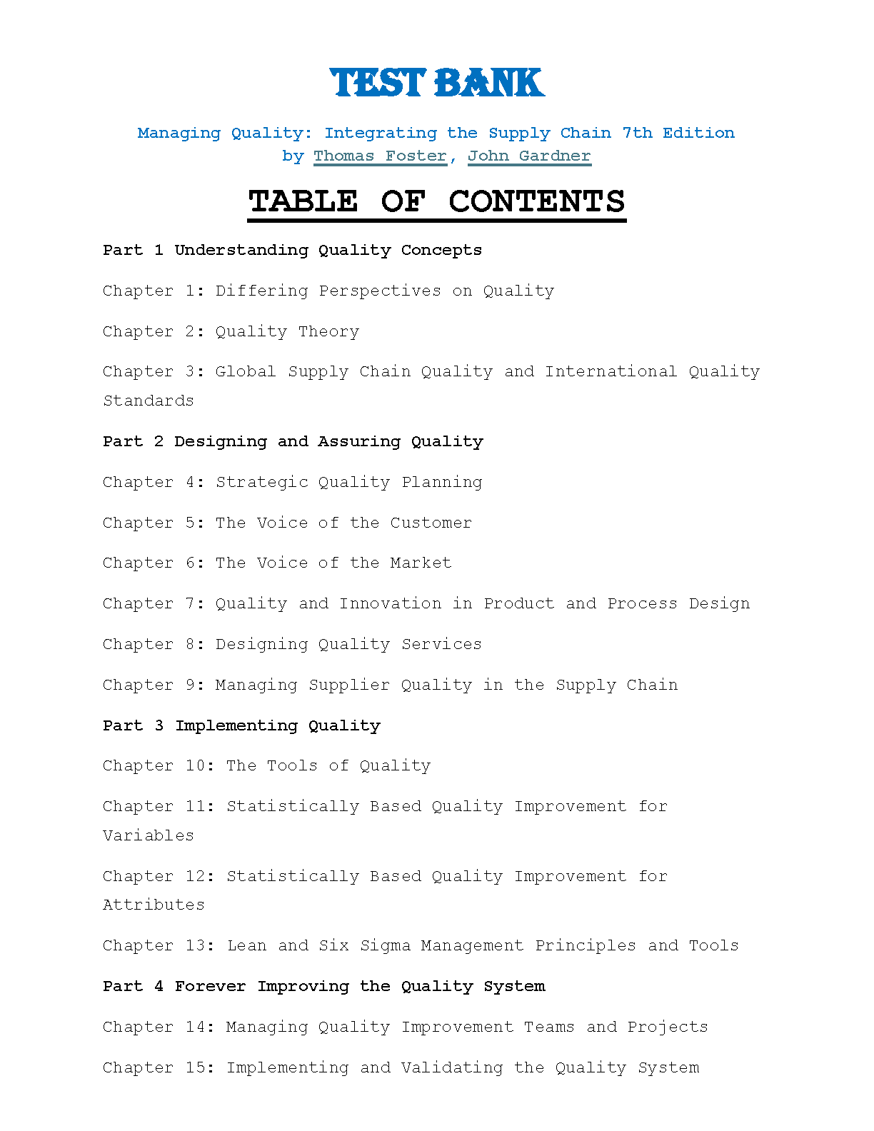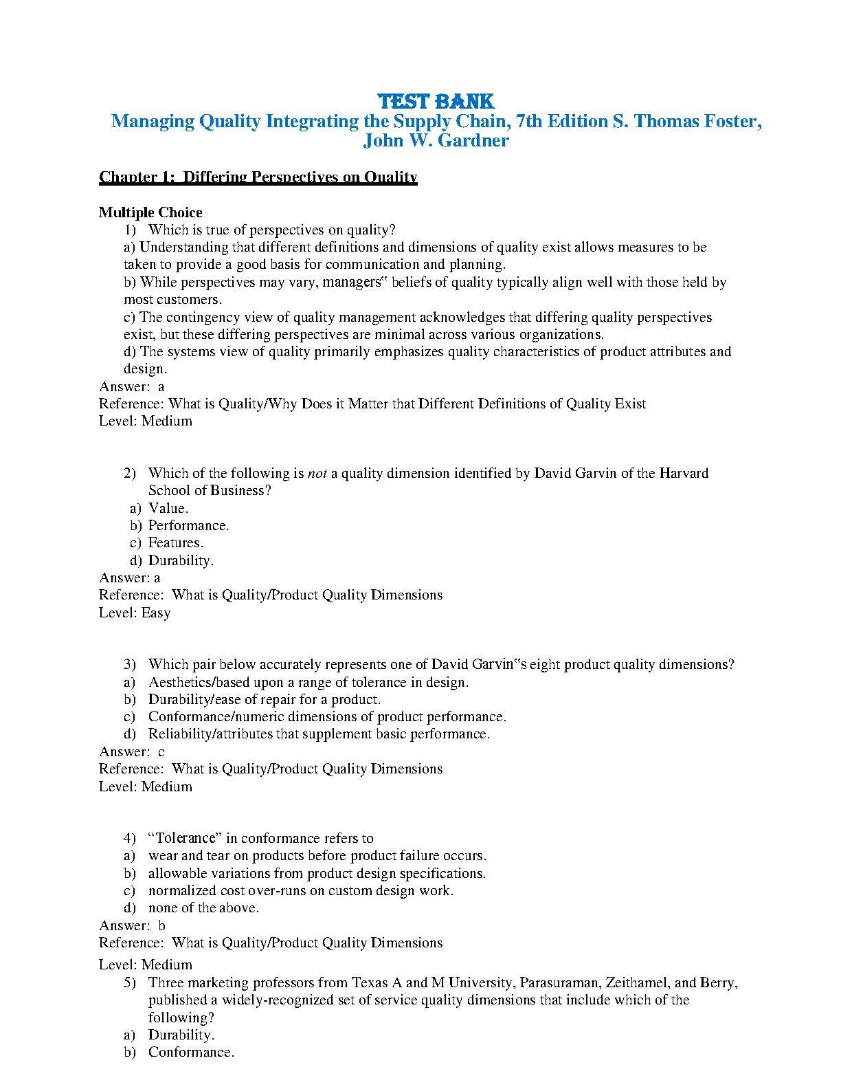 Ace your exams with this comprehensive test bank for Managing Quality: Integrating the Supply Chain, 7th Edition by S. Thomas Foster and John W. Gardner. This resource is designed to help students master the core concepts and prepare effectively for assessments, increasing their chances of success and avoiding resits.