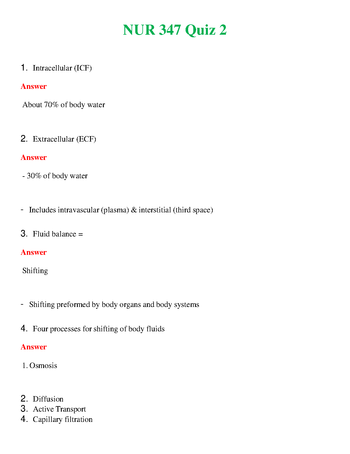 NUR 347 Quiz 2: Fluid Balance and Body Fluid Shifting Processes