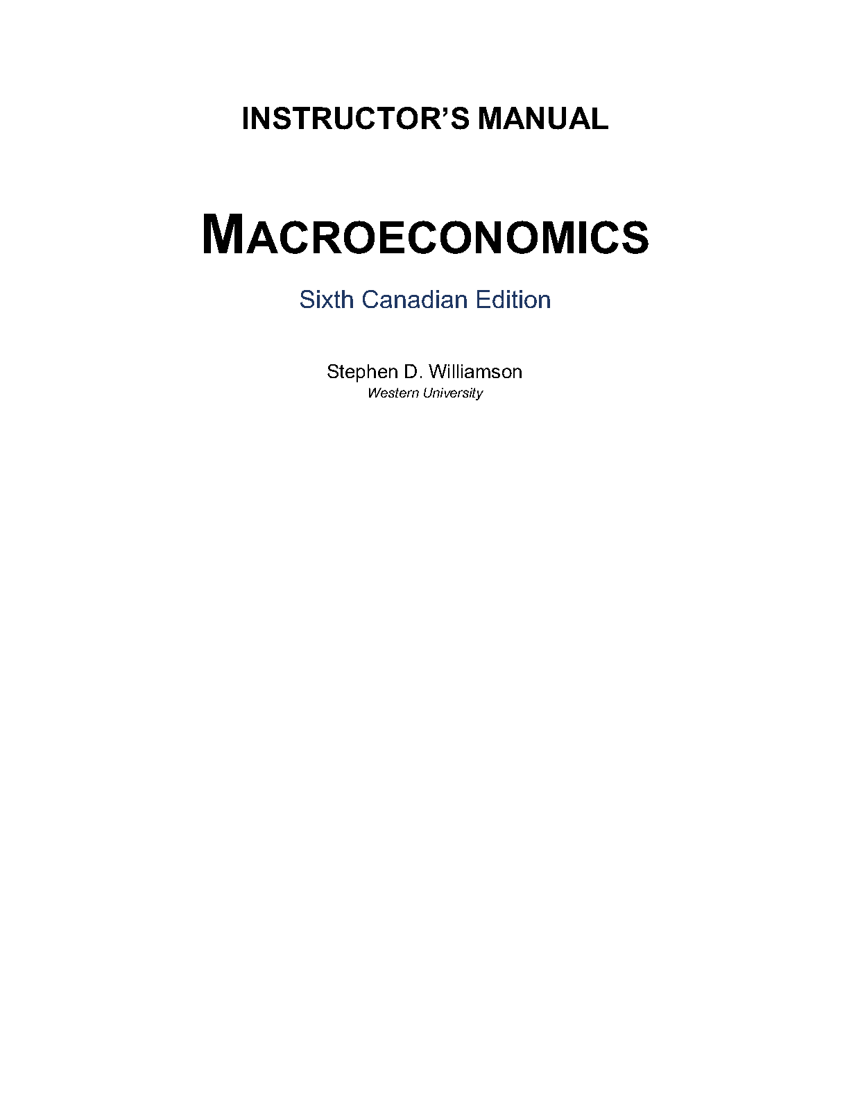 This Instructor's Manual accompanies the Sixth Canadian Edition of Macroeconomics by Stephen D. Williamson. It's a valuable resource for educators teaching macroeconomics, providing supplementary materials and support to enhance the teaching experience. Designed to help students grasp key concepts and excel in their studies.