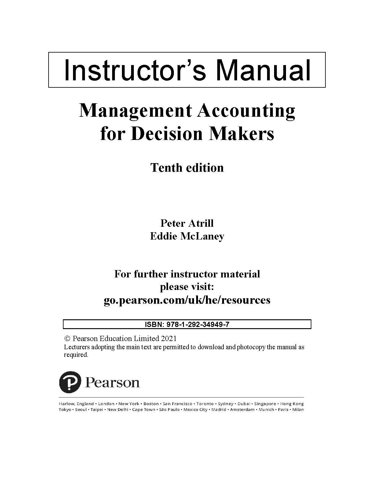 This comprehensive instructor's manual accompanies the tenth edition of Management Accounting for Decision Makers by Peter Atrill and Eddie McLaney. It provides instructors with valuable resources to effectively teach the subject matter, including detailed lesson plans, solutions to end-of-chapter problems, and assessment materials. This resource will help students understand the concepts and pass their exams on their first attempt.