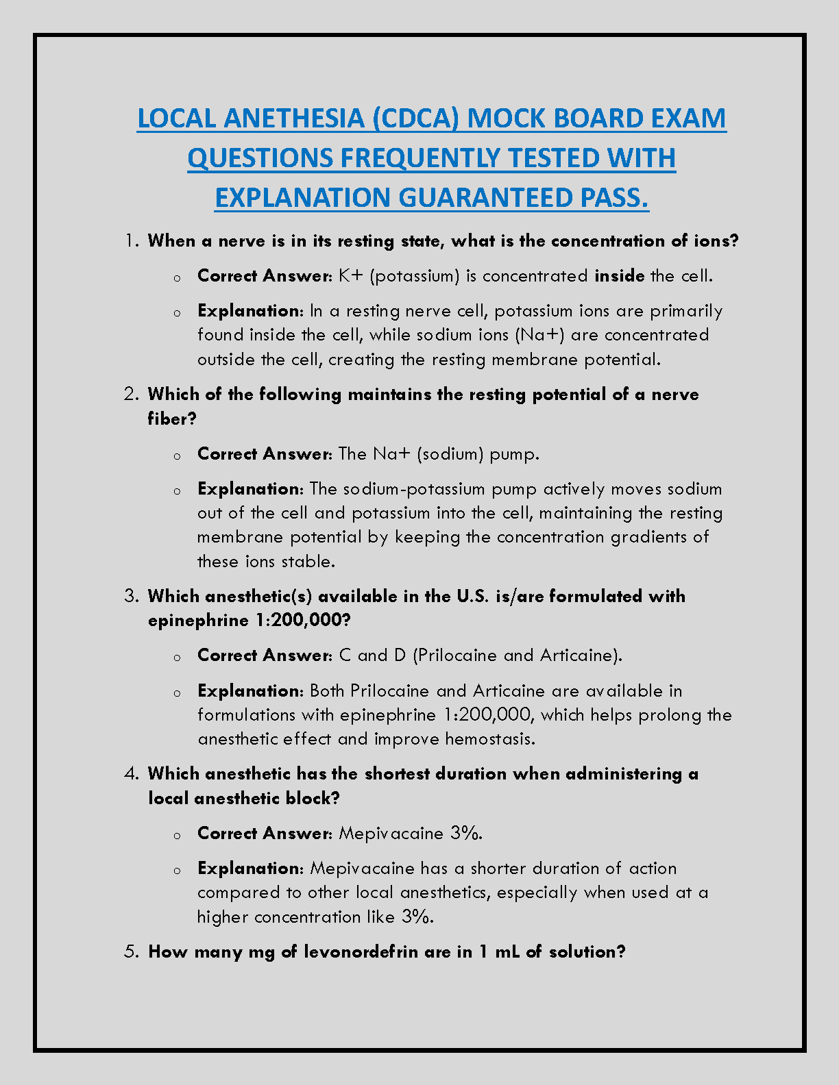 Local Anesthesia (CDCA) Mock Board Exam Questions and Answers with Explanations: Guaranteed Pass