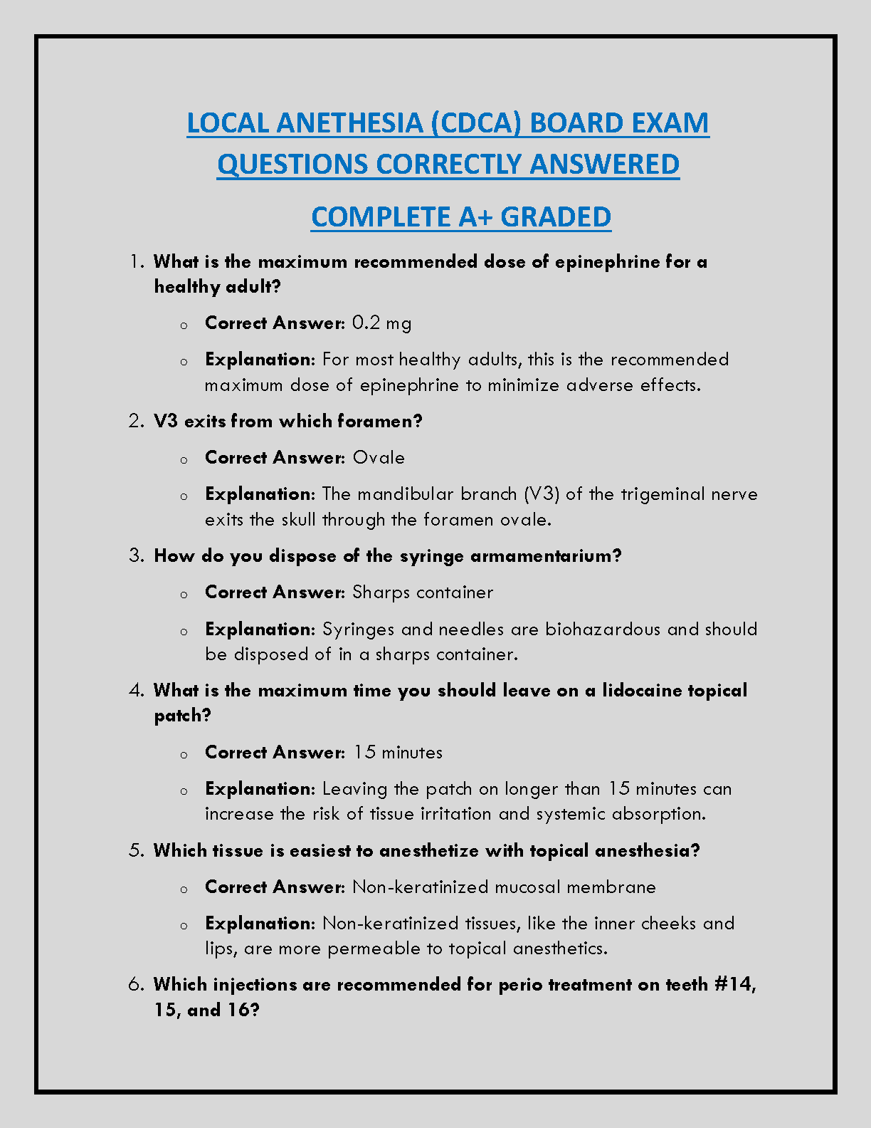 Ace your Local Anesthesia (CDCA) board exam on the first try with this comprehensive guide. This complete A+ graded edition provides answers and explanations to key exam questions, ensuring exam success and avoiding resits. Perfect for 2024/2025 academic year.