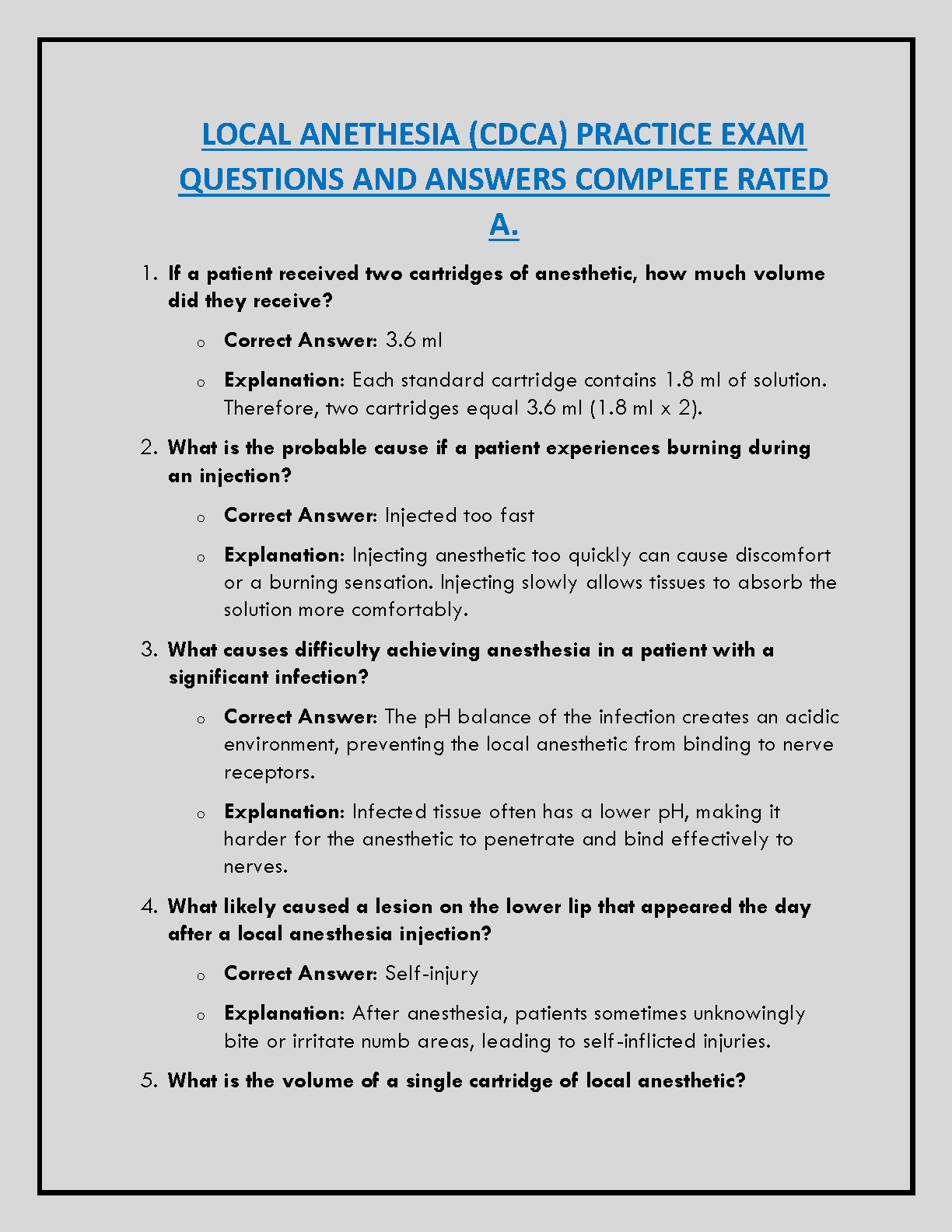 Local Anesthesia (CDCA) Practice Exam Questions and Answers: Complete Rated Edition