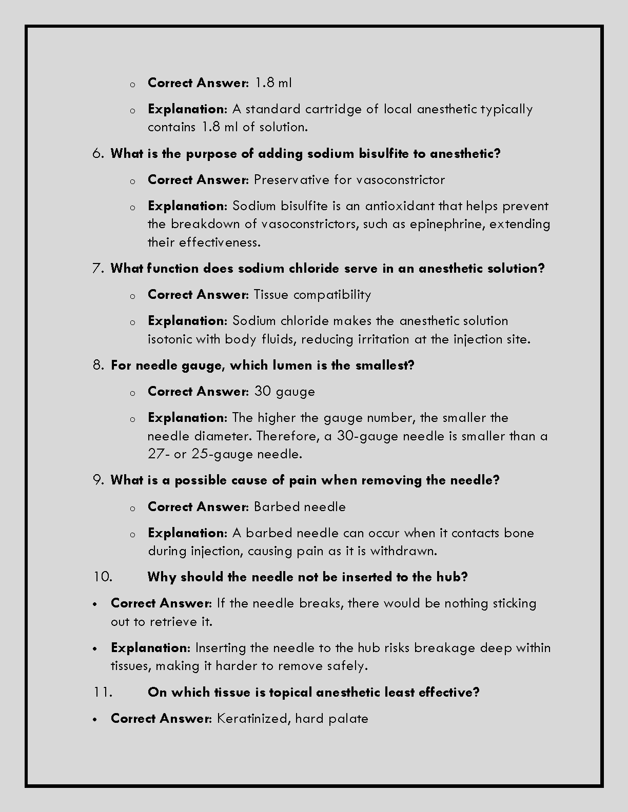Ace your Local Anesthesia exam with this comprehensive practice exam featuring questions and answers with detailed explanations. Perfect for dental students and professionals, this resource is designed to help you master the material and pass your exams on the first try. Avoid resits and boost your confidence with this in-depth guide.