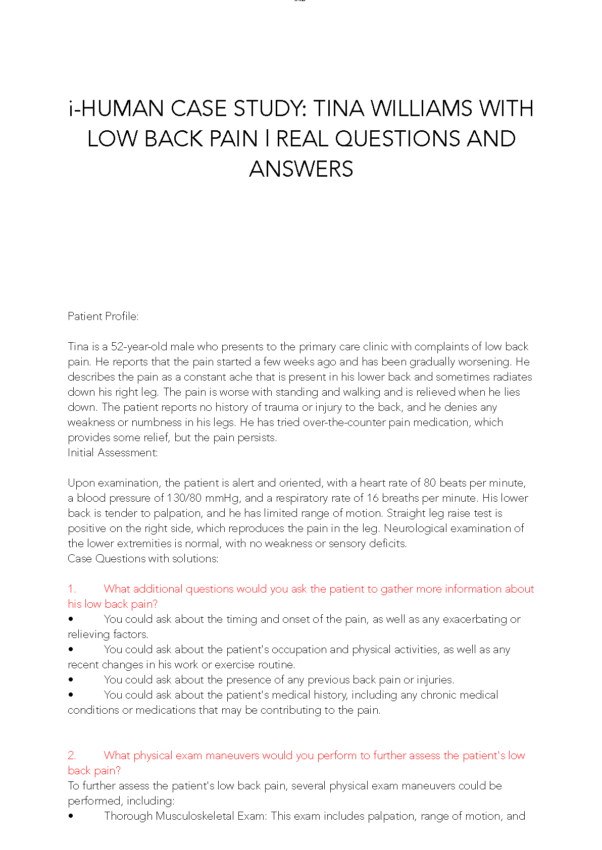 Master i-Human's Tina Williams case study on low back pain. This comprehensive guide provides real questions and answers, helping students ace their exams on the first attempt and avoid resits. Ideal for the 2024-2025 academic year.