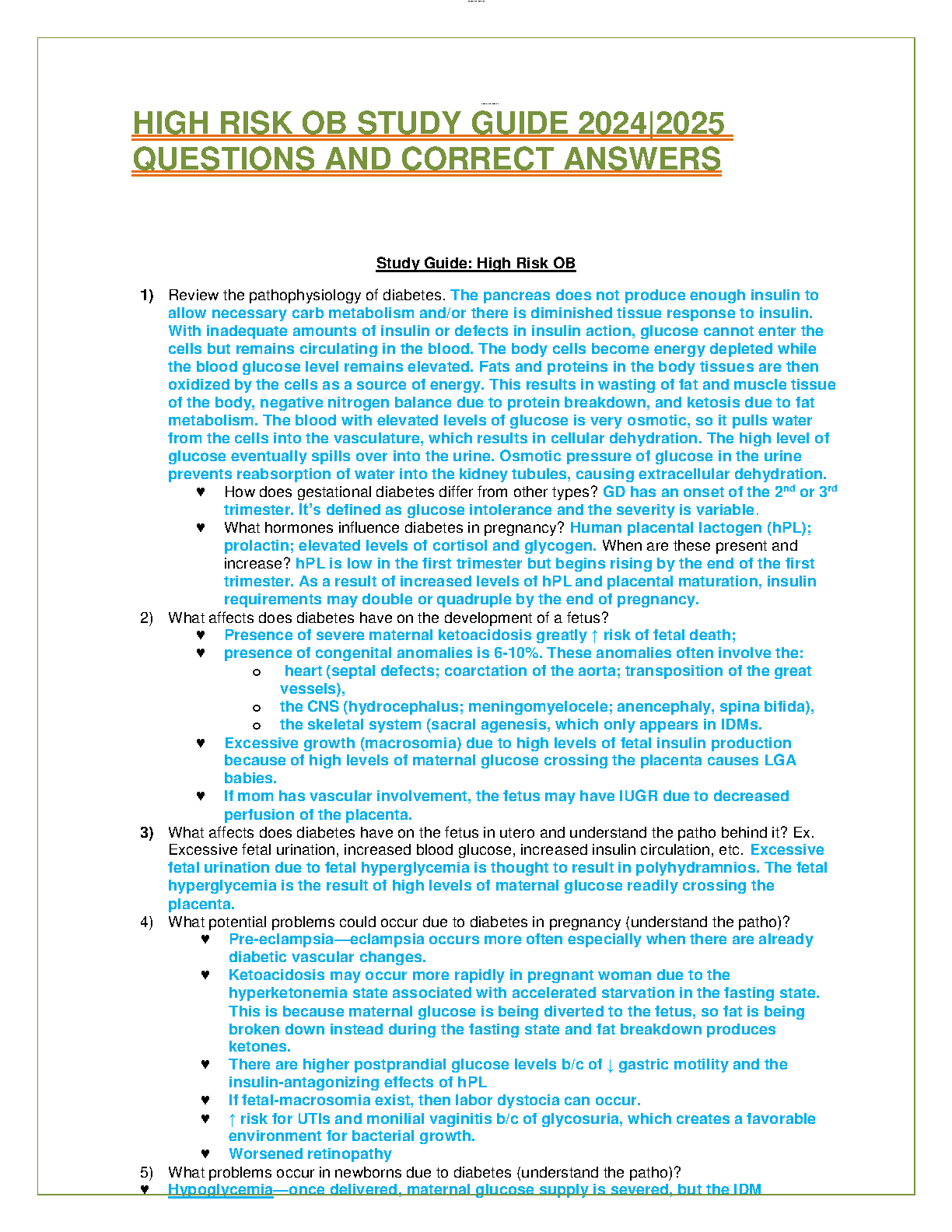 Ace your High Risk OB exams on the first attempt with this comprehensive 2024/2025 study guide. This resource provides in-depth explanations and correct answers to key questions, ensuring exam readiness and avoiding resits. Master the pathophysiology of diabetes, fetal effects, and potential pregnancy complications.