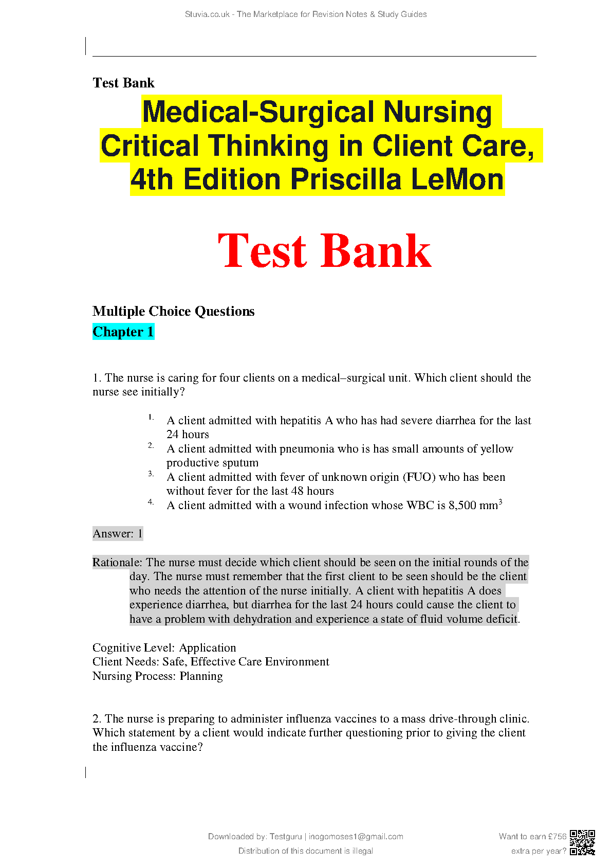 This is a test bank for the 4th edition of Priscilla LeMon's "Medical-Surgical Nursing: Critical Thinking in Client Care". It provides multiple-choice questions to help nursing students prepare for exams and master the subject matter. Ace your nursing exams on the first attempt and avoid resits with this valuable resource, perfect for the 2024-2025 academic year.