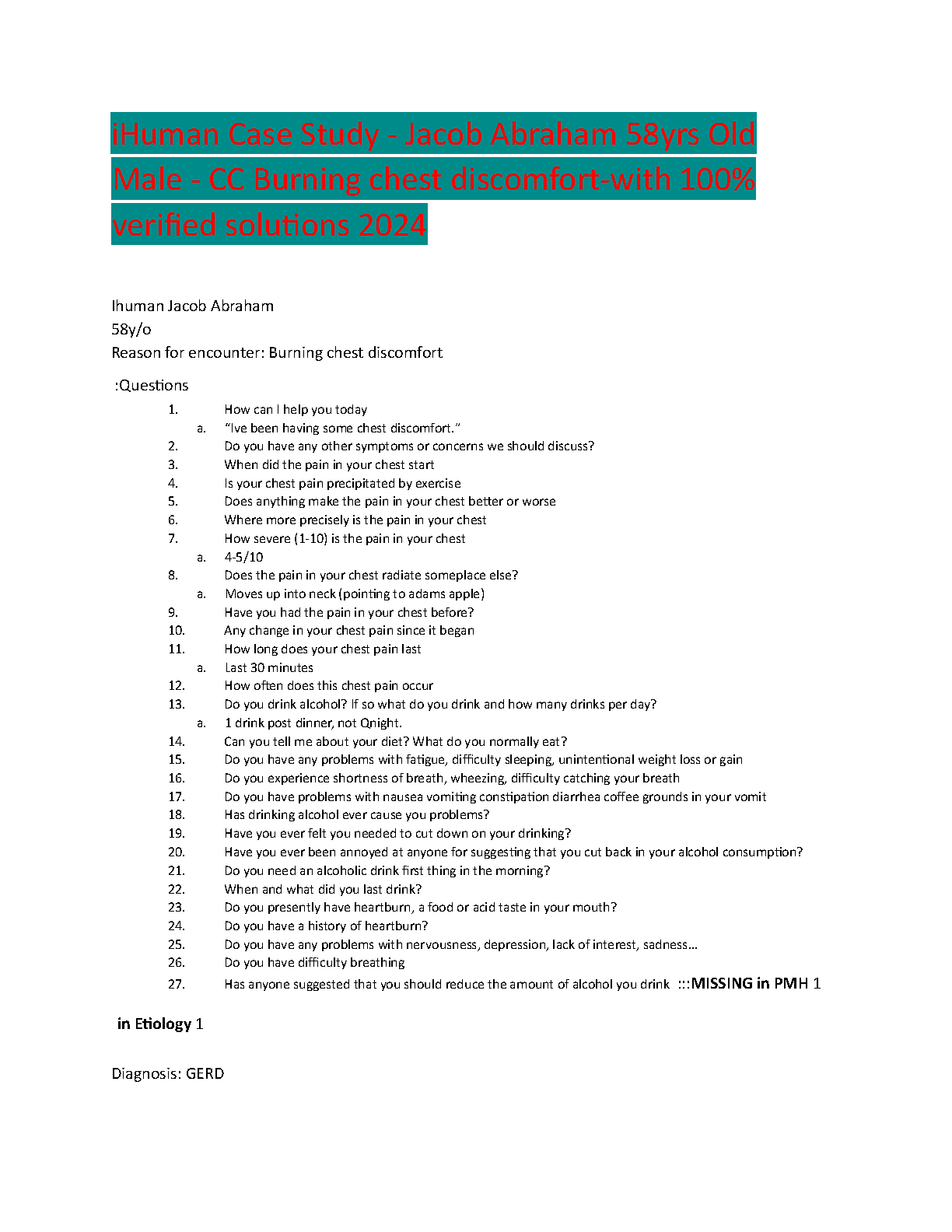 This iHuman case study focuses on a 58-year-old male presenting with burning chest discomfort. It provides a detailed patient history, comprehensive questions, and a final diagnosis of GERD. Ideal for medical students and professionals seeking to enhance their diagnostic and clinical reasoning skills. This 2024/2025 edition provides verified solutions, helping students master exam material and avoid resits.