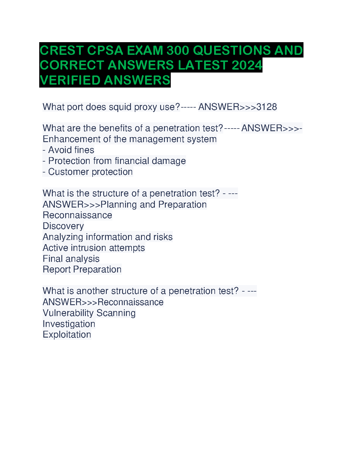 Ace your CREST CPSA exam with this comprehensive guide. Get verified answers to 300 exam questions for first-attempt success. Prepare effectively and avoid resits with this latest 2024 edition.